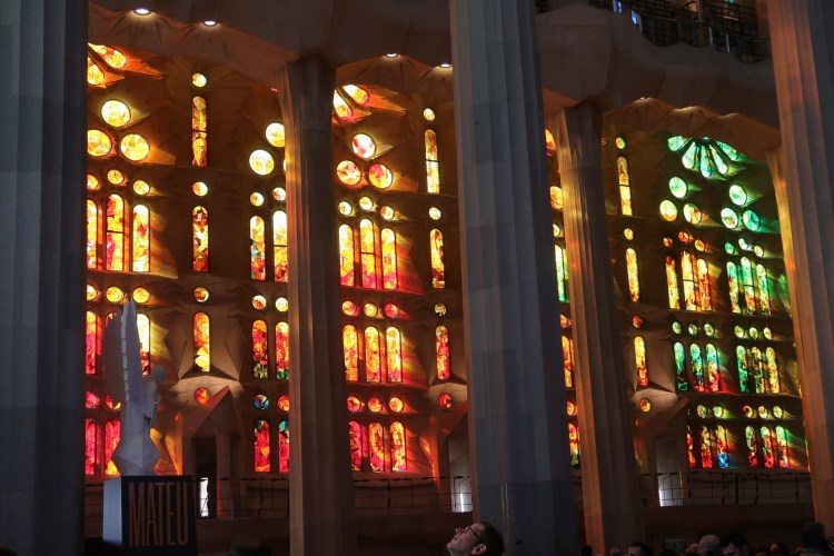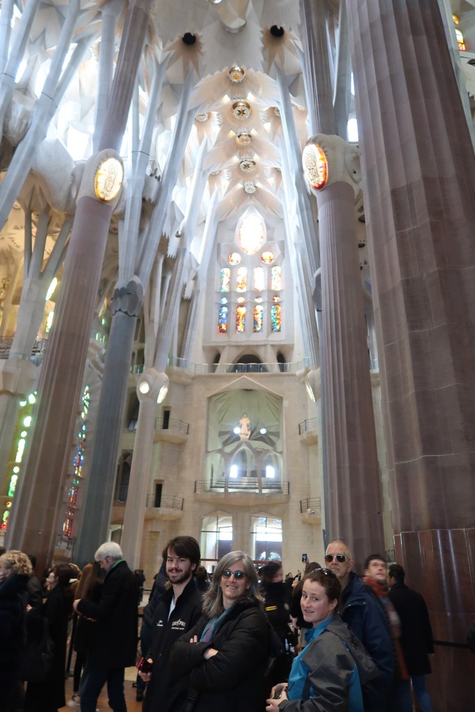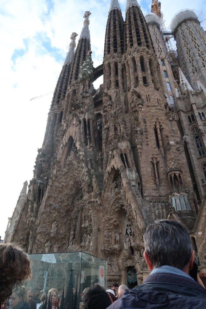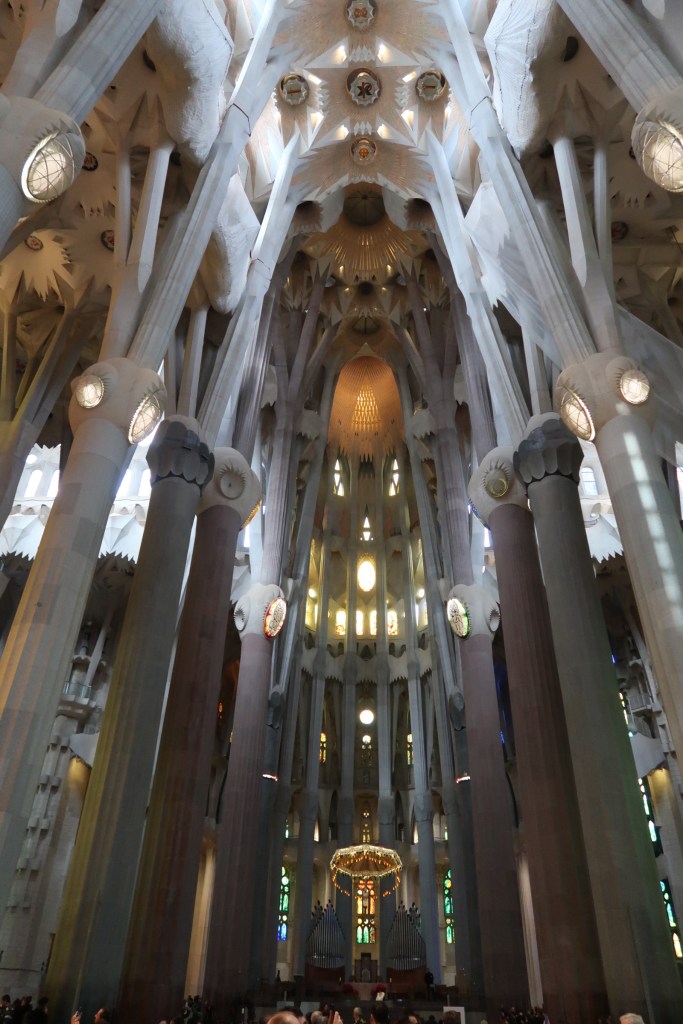 Seeing the tall construction cranes overhead working to complete the 300 foot and the final 500 foot towers on the outside, I did not realize that the inside had been finished for almost a decade. Walking through the story of Christ, from his birth (the Nativity facade), to his death (the passion facade), and through his life and resurrection (the Glory facade) was inspiring. All of this is told in stone on the outside and on the inside it is bright as being outside on a sunny day. It is unlike any church or cathedral in the world. Gaudi believed God was most accessible and seen through nature and so inside he created a forest of colums that branch out to the spires, and there are curves and organic forms throughout. The doors even have bugs among in the metal flower petals. All of this inside is bathed in such wonderful light it is awe inspiring and appropriately puts one into a more reflective and spiritual state.