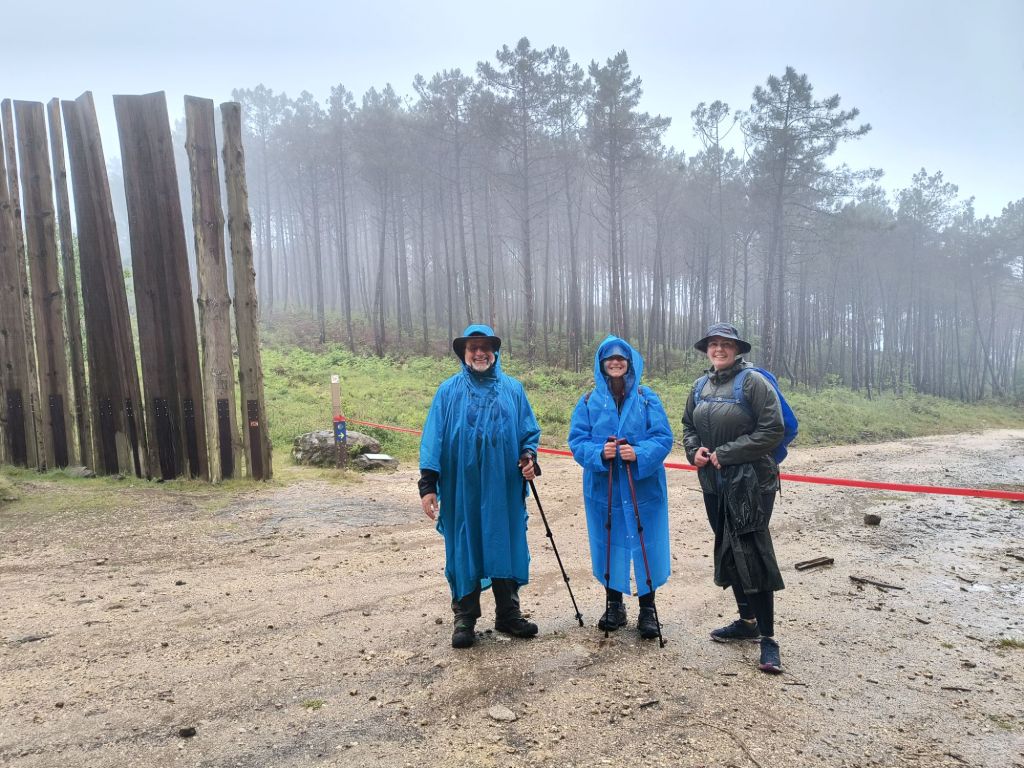 Siri and David are showing the latest in Camino fashionHalfway though at Cruz dos Frances – we added our rocks to the base to mark our passage as many had done beforeWe began our trail on the rock pathway next to what was now a streamSome nice cascades in the river LagoWe walk with our Denmark friend Christine and catch up with our Bolivian friend Coco. He was also telling his friends that he had met an old friend from dancing 23 years ago. “You were just a kid then,” he kindly says to me.A chapel and cafe spot before we started up the highest point of the Camino Portugués – Alto da Portela Grande Stunning views in northern Portgual One of the many pilgrim fountains along our wayAt the top, we find some official looking people with walkie talkies – they are getting ready for a big car race next week, checking out the dirt forest roads. We are surprised to find out they race in a souped up Toyota Yaris.The breathtaking views after the steep climbMany signs help lead our way – this one is a firstWe head down the hill to our Albergue (hostel)A nice hot lunch while wrapped in a dry towel refreshes the soul at the bottom of the hill. It is here that a French couple arrive smiling in spite of it all (they even do a quick dance and twist to the background music) points down and remarks “it is a swimming pool in my shoes!” And we all laugh in agreement.Siri relaxes in our down sleeping bag to finally warm up