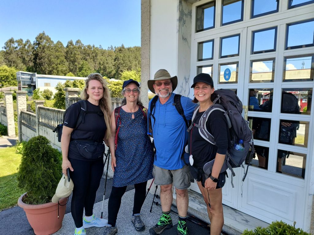 Such as when we were gritting through the last few miles today, we met up with our Russian friends from climbing up to the Monastery. Their company greatly eased the end of our journey as we laughed about our kids (they each have 3), our planning (they just thought up this trip 10 days ago) and our shared camino. Each encounter seemed more special since we didn’t know if we would see them again – and we did. Last night, on the boat, in front of the cathedral and now as they come out of the restaurant they catch us on the sidewalk. We chided them a bit since they told us they planned on walking the whole 18 miles to Santiago and we keep catching them. They are good story tellers and we thank them for the lift – of our spirits. They thank us since they believe we actually have helped them more. All in our perspectives and expectations.