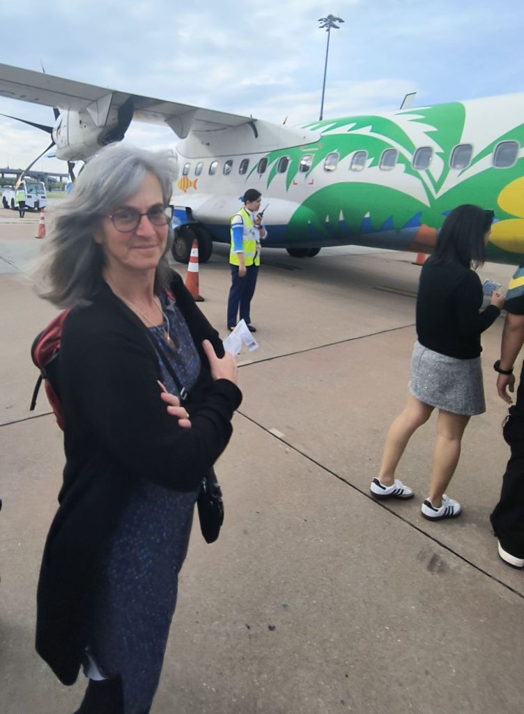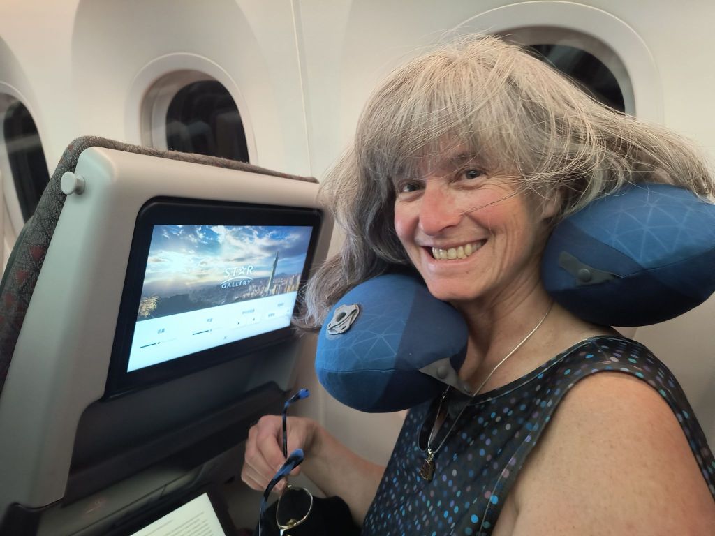Our first impressions: The Thai people are incredibly friendly and willing to help you out – be it helping us find oue gate, bubbly water, or choosing your transportation. As we crammed onto two benches with 8 other travellers and our bags were packed on top of the cab of the pickup, Siri and both commented – it reminds us of our peace corps days. Actually much of it brings back good memories of living in the Dominican Republic and in Indonesia. The flat open countryside of rice fields, banana and palm trees all around, a few dogs running loose, concrete and brick single story houses, being passed by scooters and motorcycles. Even the small fruit stands, coffee shops and stores on the side of the highway. Similar large billboards ads, just in a different language. The hustle and bustle of the countryside – not of the big city.