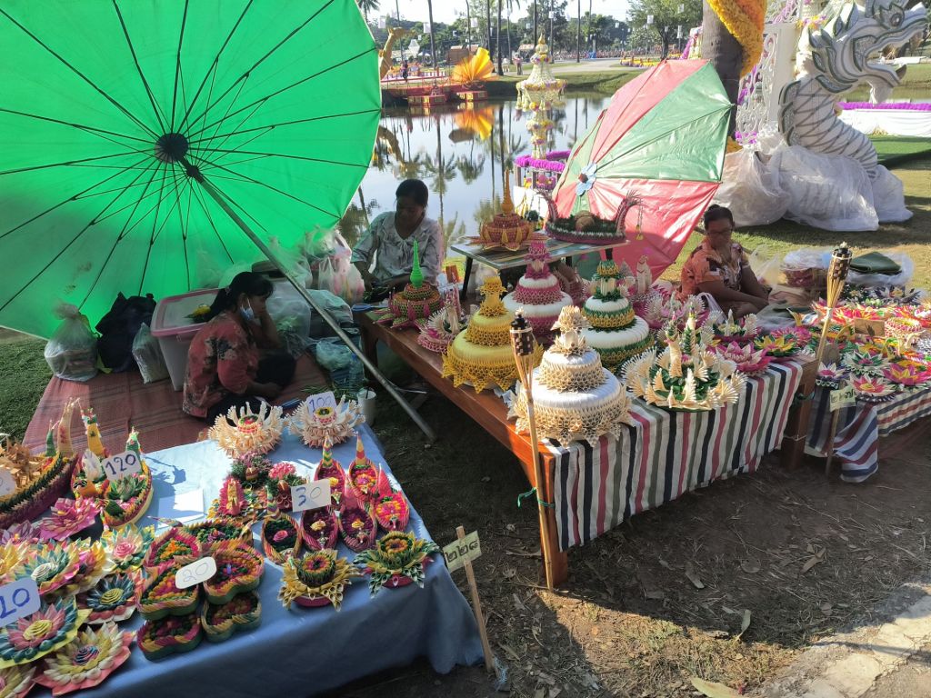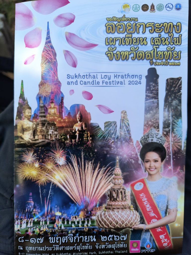 Our first guide – named Siri – no kidding!Our first tourist police officer – Chiang – guess our guide forgot to fill out the proper paperwork since she was in such a rush this morning when our hotel called her.The kind officer gave us a brochure about the eight day festival. He was not as nice to our guide – she was detained for almost an hour and only got out of paying a hefty fine by calling our hotel owner directly who then called the officer’s boss – guess it still matters who you know.Biking through the countryside Our fine single speed beach cruisers – actually did just fine for the flat 20 mile bike rideOur first elephant – at the bottom of a temple… Next to a four armed figure holding a tree of lifeOur first of many temples of the day – did not make it to all 90+ temples in the park. A typical design with the building in front where monks would help educate the people – like the first schools and then the bell shaped stupa in back. Be sure to always walk around clockwise – for good luck The rare walking buddhaTaking a break for teaThe standing buddha – had to climb 200 feet up a steep hill for this one. Our guide told us how she interpreted the symbolism in the statues – The eyes are down since one must first see themselves clearly before helping others, ears are long since one must always hear both sides equally, hair is curly as a sign of deep thinking, and the burning flame of knowledge on top. The feminine body is distinct to Thailand – she thinks it makes the Buddha more beautiful.The sitting buddha – this is the temple where we got to meet the tourist policeThe mixed temple – sort of like a mullet – Buddhist in front and Hindi in back. The King’s way to help the country transition to his new national faith.Dogs are surprisingly docile here – they don’t even move out of the road as you bike buAt the festival – these are the offerings to place in the water to thank the water gods