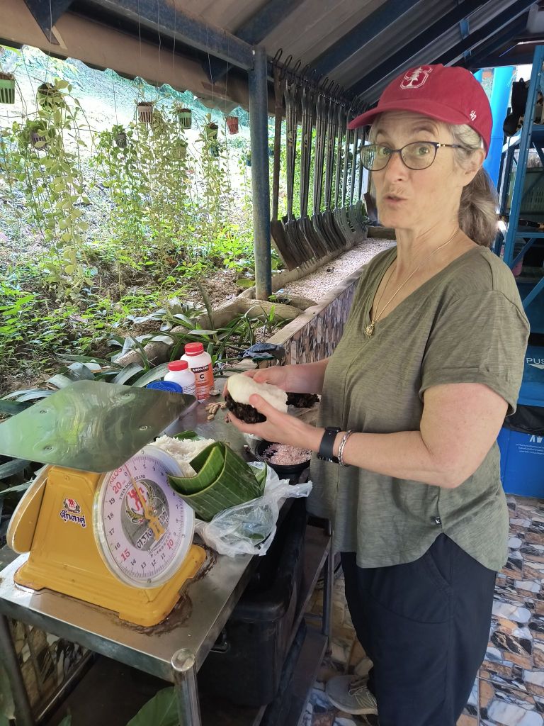 We start each day having a full vegetarian breakfast at the rainbow pavilion and then head up to the medical tent for daily treatments. Right now there are 2 elephants that need daily foot care. One stepped on a land mine and has permanent nd one that needs extra vitamins. We chop up a box of apples which is the treat they receive as they are getting their feet done.