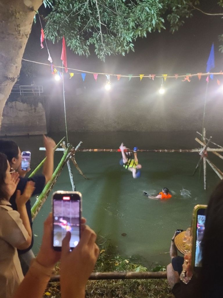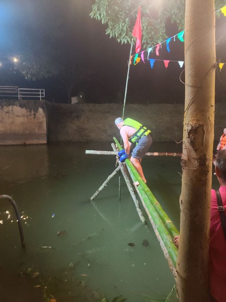 After watching a few rounds, seeing Katherine’s 8 and 10-year olds participate, and being coaxed a lot, we decide to join in. Joe – a 21 year old from the UK and I put on our lifejackets and gloves and head to the ring – or the water on bamboo trees.
