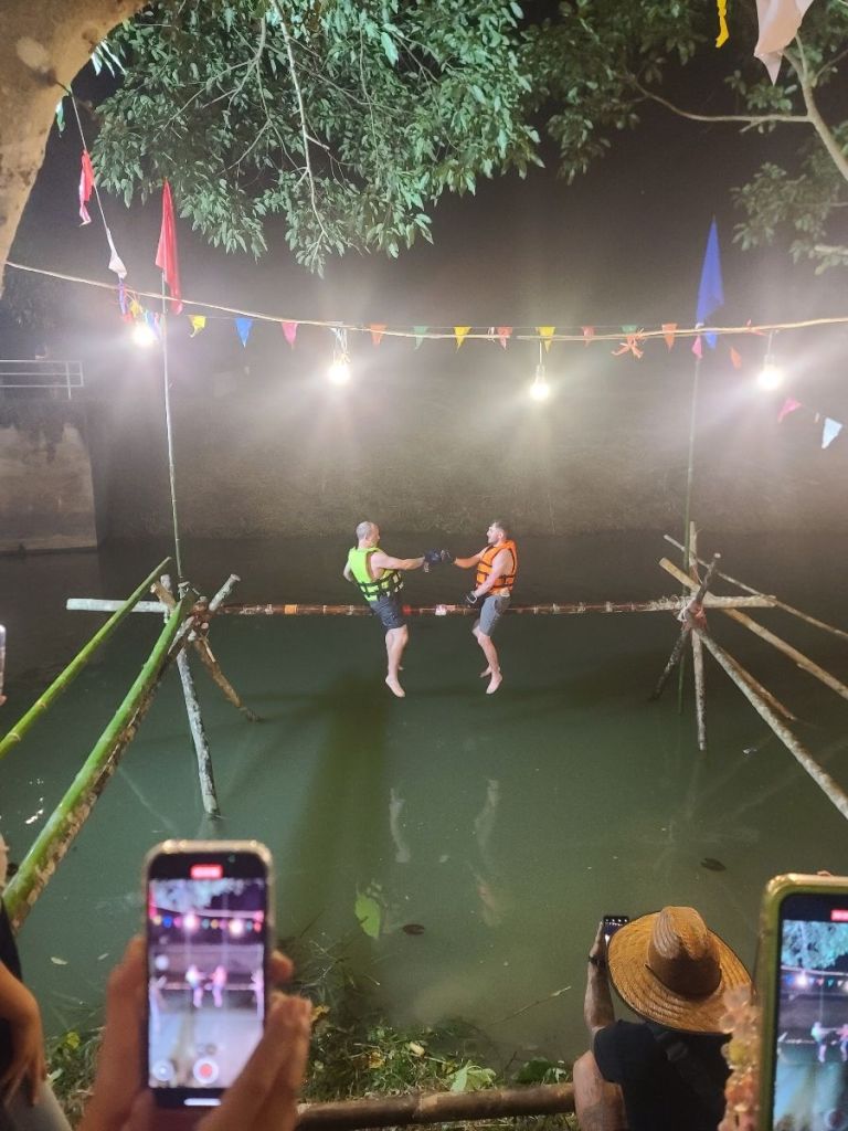 We watch as a few participants out on their lifejackets and boxing gloves and walk carefully into the bamboo stick painted red and white to show where one needs to start. The game does not take long – one quickly loses your balance and hangs upside down as the other tries to shove you off. At the end – everyone gets wet.
