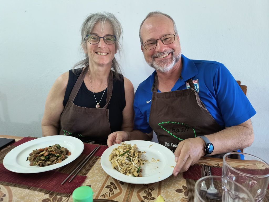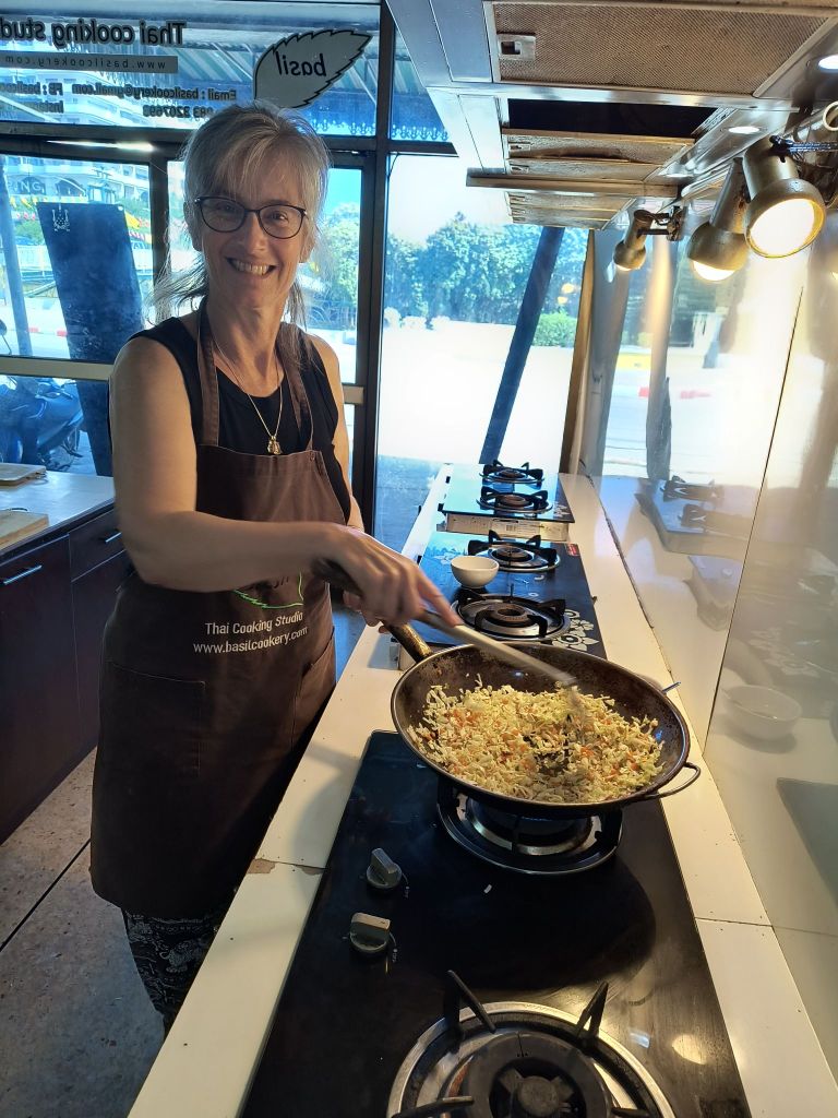 There are only five of us, a mother and daughter from Wales and a younger very tall German. We all have a great time being sous chefs as we make Phad Thai, green and red curries, coconut and hot and sour soup, and then finish off with fried banana and mango with sticky rice. There was enough food for a few days.
