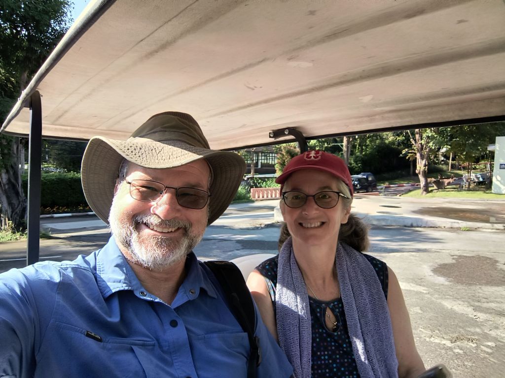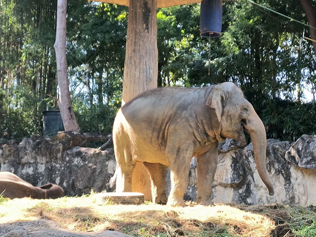 It is an almost 4 mile hike out of the city along a very busy commercial corridor. Along the way, we pass CMU (Chaing Mai University) and see lots of students, motorcycles and red trucks (a key form of public transportation). Then see there is a green space and take a detour into the arboretum – which is really admin buildings amongst some trees, still a nice respite from the traffic. We notice people walking and running around what in the map shows is a reservoir, but we can’t seem to find a way into it across the tall cement wall – and we still have a zoo to get to.