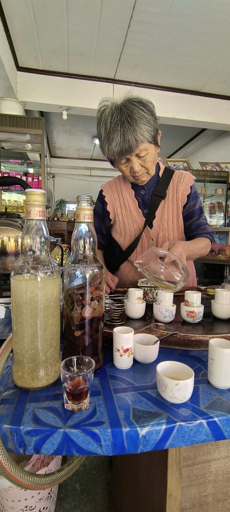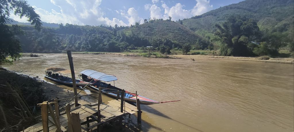 Our driver makes sure we are ready to goJust the four of us on a very narrow long tail boat that are still used for shippingWe can survey the devastation from last months flooding on the Maekok River which flows into the more famous Mekong river at the Laos borderWe tie up at his Lahu village (Not all ‘hill tribes’ actually live on hills) an hour later after boating past beautiful scenery that includes orange and mango groves, a few sand dredging operations, more temples (Burmese style now), and a lot of washed out banks.We drive up into the mountains of Doi Mae Salong, into Santikhiri, a Yunnan Chinese community that left China in 1949 after the revolution. We stop at the “Martyrs Museum” of those who died fighting the Mao insurgents along the borderMeet another amazing female entrepreneur – this one runs a Chinese tea shop, took over from her parents, and we try out 8 different kinds as she shows us the traditional way to warm up the bowls, and our hands, before drinking She is also a good salesperson as she has her vacuum packed bags color coded for export.What is left after our tasting – and she encouraged us to try her homemade honey whisky and another herbal alcohol – whew! She says she has never gone to the hospital or been sick because of her teas and whiskyOur view across the border into Mynamar when we stopped for lunch at a popular Chinese restaurant At 101 Tea plantation – the largest in Thailand. All of these bushes are oolong tea bushes. The new leaves on top are cut every 3 weeksWe arrived in Chiang Rai (the northernmost large city of 200,000) and learn more about the hill tribes and their customs at a local non-profit that supports them.