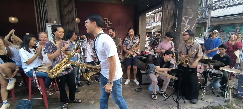 Well, we had help from a talented 12-piece jazz band – complete with a full brass section – and the 50 or so people who saw the post that this was the first night of the annual Chiang Mai Street Jazz festival. They also combined it with the Chiang Mai Swing dance dance team – really, who knew?