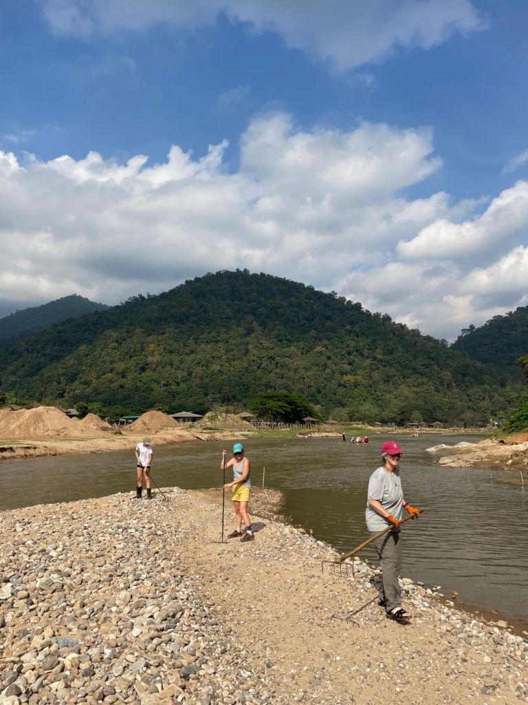 So this afternoon, we were tasked with continuing that effort to get it back into shape. Our first task was cleaning an obstacle free trail for the elephants to get into the river. We had to wade into the river, use some rudimentary tools (didn’t know a rake could be made from rebar), and in the heat of the sun, move rocks to make a sandier place for their feet