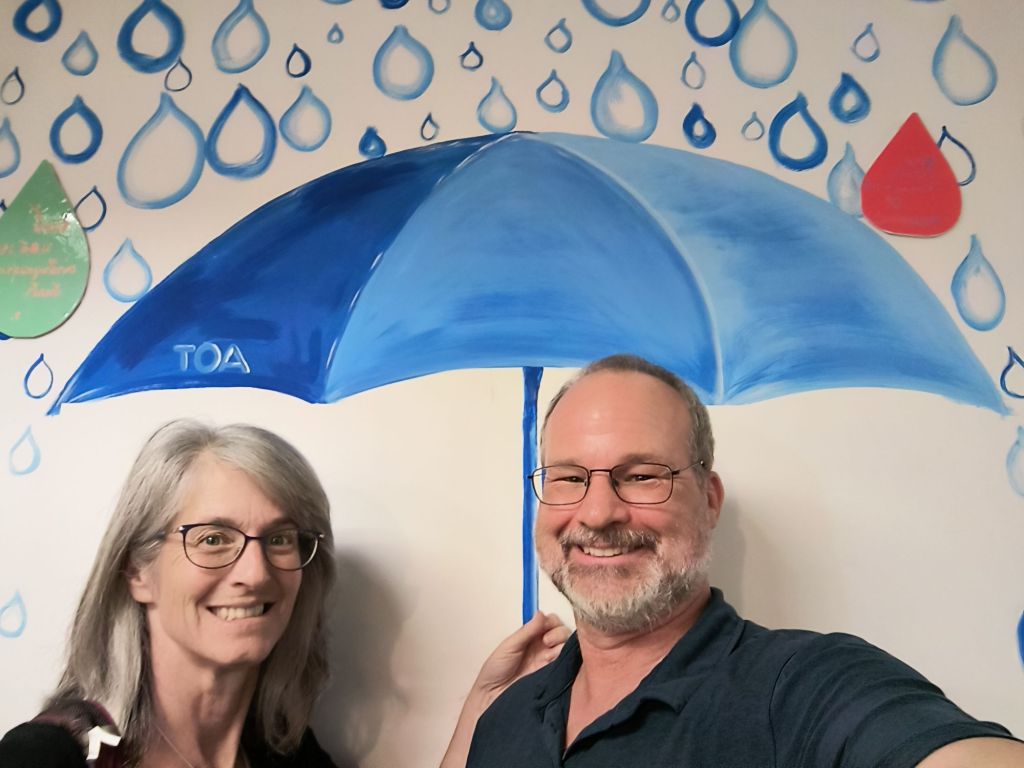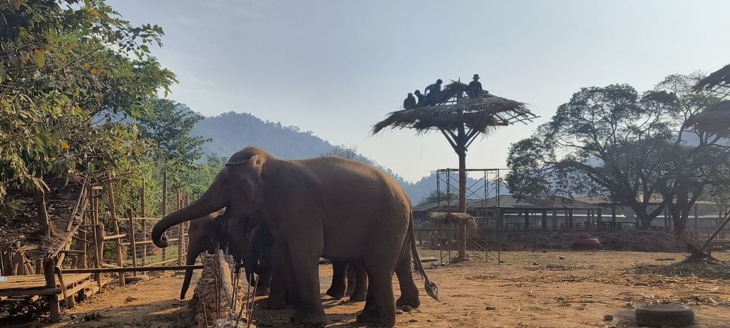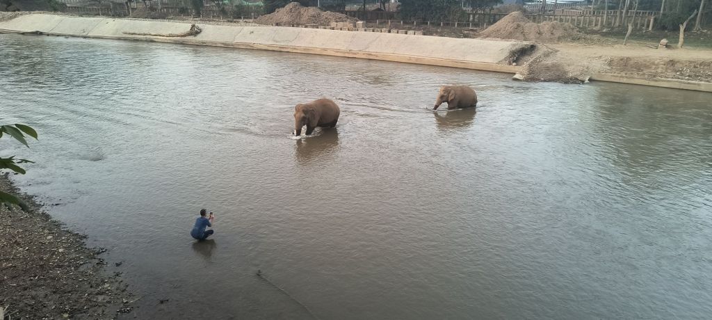 We start off each day watching the sunrise and now know some of the typical schedules. The kitchen is already working to get breakfast served at 7 am, then the staff arrive by scooter or walk (many live near or in the park), and then our favorite part is we seem to be the only ones who realize that two elephants start their day walking across the river. It has become sort of a ritual to sit and wait for them and welcome them. This morning, Darrick is on this side to welcome them along with their mahouts. We find out one of them, Saree, was reunited with her mother at the park after being rescued. Quite the story.