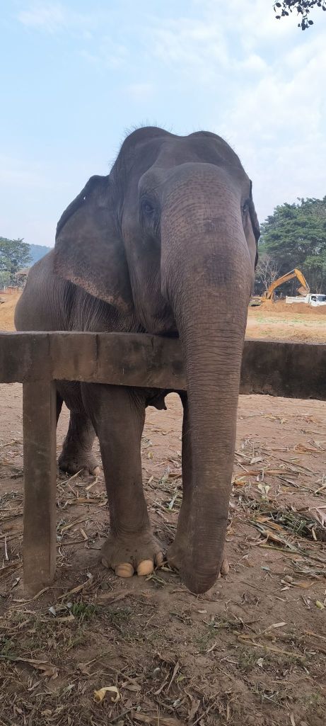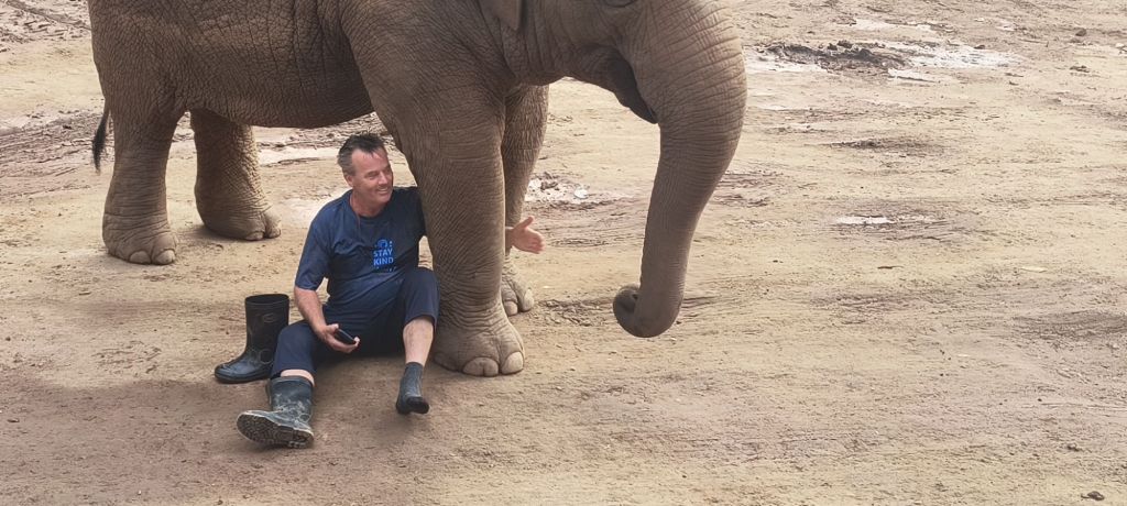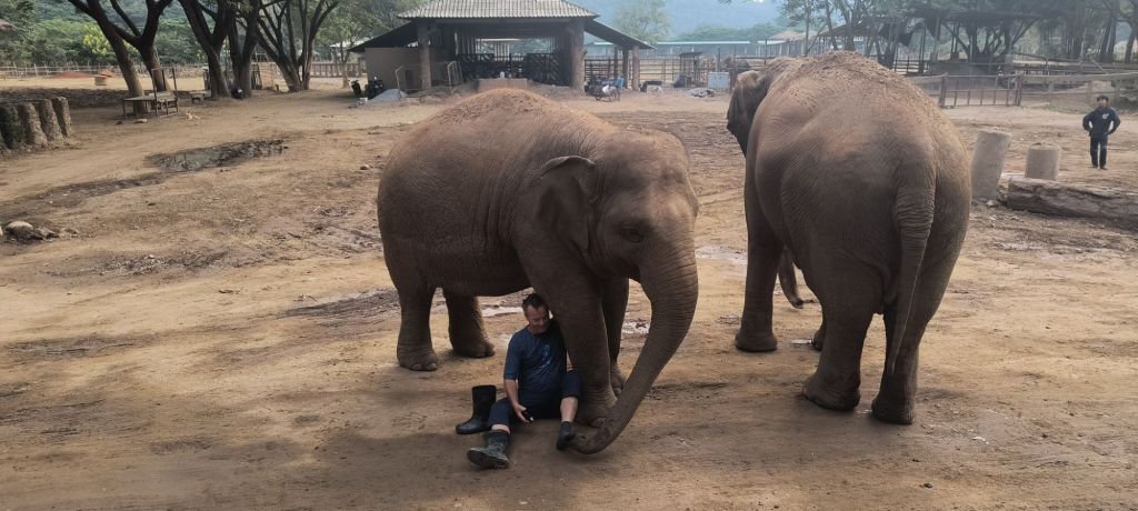 After breakfast, we find Darrick being ‘tackled’ by some other elephants and he sits down and takes off his boots. “She doesn’t like me wearing shoes,” he explains. Which seems true as she is using her trunk to inspect his toes. “Guess she is telling us that we need to be more connected directly to the earth.” Note to self, watch your shoes around this elephant. 🙂