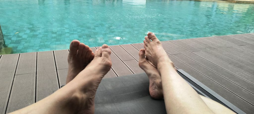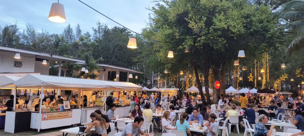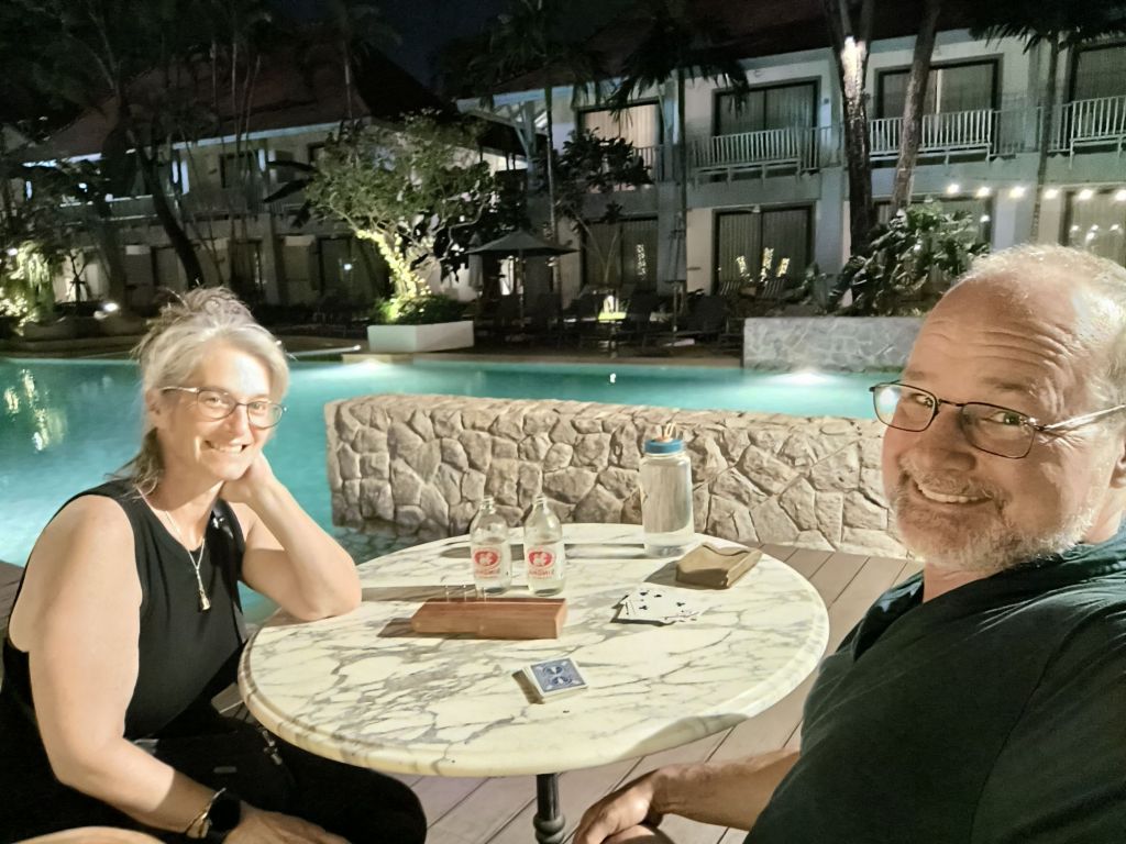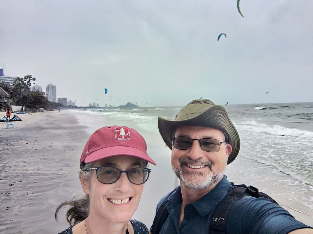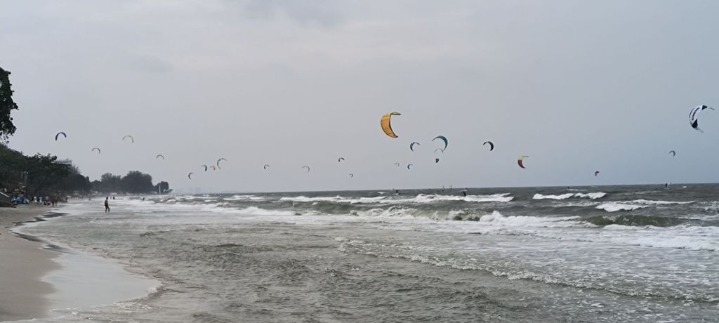 We head to the beach after breakfast (we find the nearby French Bakery and Cafe – the local expat hangout)We are surprised to find out how many kite surfers are hereWith consistent winds of 20-25 miles an hour, it must be ideal. We count at least 35 kitesOur view for most of the afternoonWe head out for the weekend night market for dinnerThe name of the market makes me think I have heard their deafening sounds already on our tripWe finish the day by the pool with our nightly game of cribbage