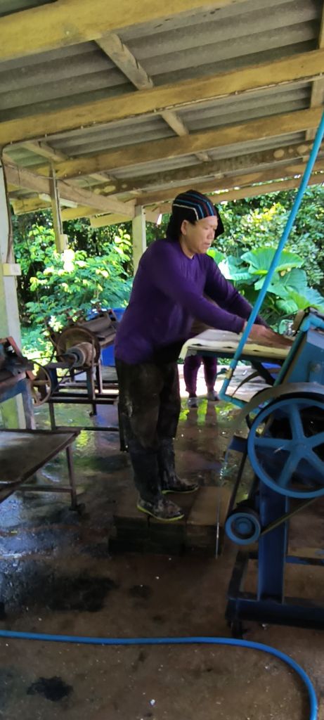 Our first stop is a university supported working rubber plantation. We see the different color trunks that show which of the four groups they are in: Green – no fertilizer up to White – fertilizer twice a year. Current results are in – fertilizing just once a year produces the same yield. I get to try out the slight cutting technique that starts the sap running and later Siri gets to put the congealed white concoction 2 inch slab into a flattener which creates an almost yard long 1/4 thick rubber mat which fetches about $2 each. All of this will be tires, shoes, and, after a bit of chuckle, we find out that only the best grade is used for condoms