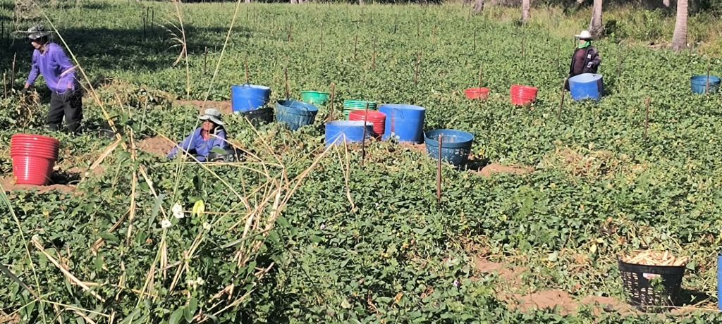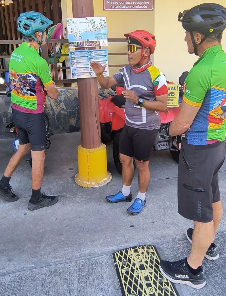 A few minutes later, we stop to watch the 4 foot monitor lizard sunning itself on the trail next to us and we remark that they are protected in Bangkok where we saw several in the main park in our walks. Hueng mentions that if we were back at his home he would be eating that too.