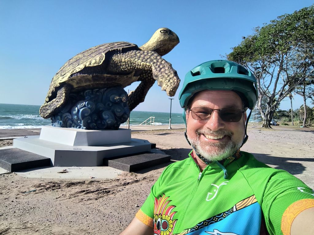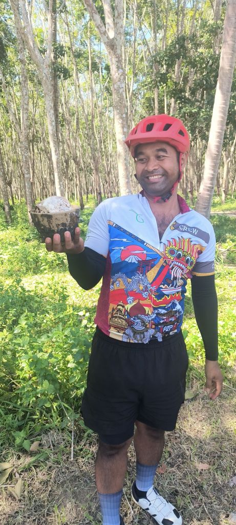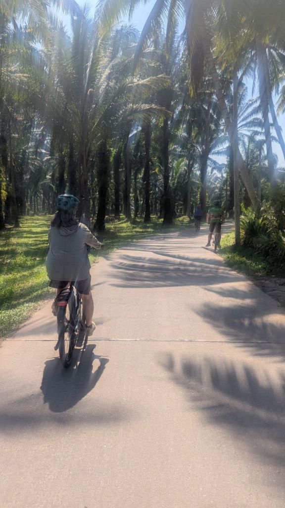 We pass by the waving tall trees so laden down with coconuts that we have to dodge a few that have dropped on our bike path.