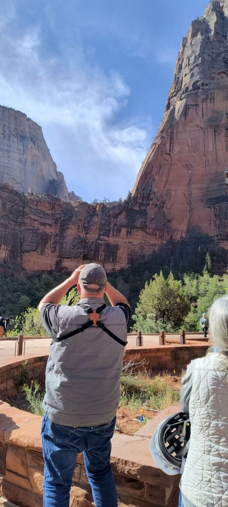 We ask him the number he is up to so far, “408 as of today, with the condors above.” We look up and see several large black wings floating up the canyon walls. We spend the next 15 minutes just watching them catch currents right above us, just below the popular Angel Landing hike.