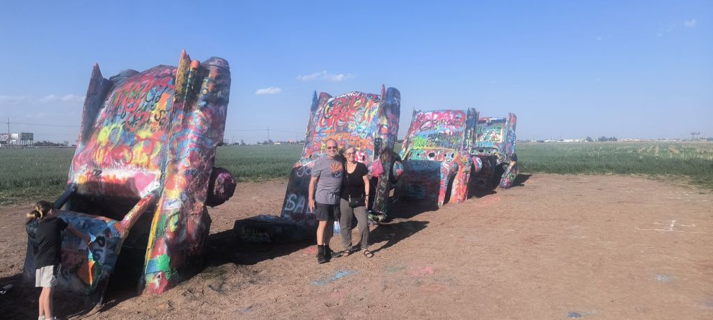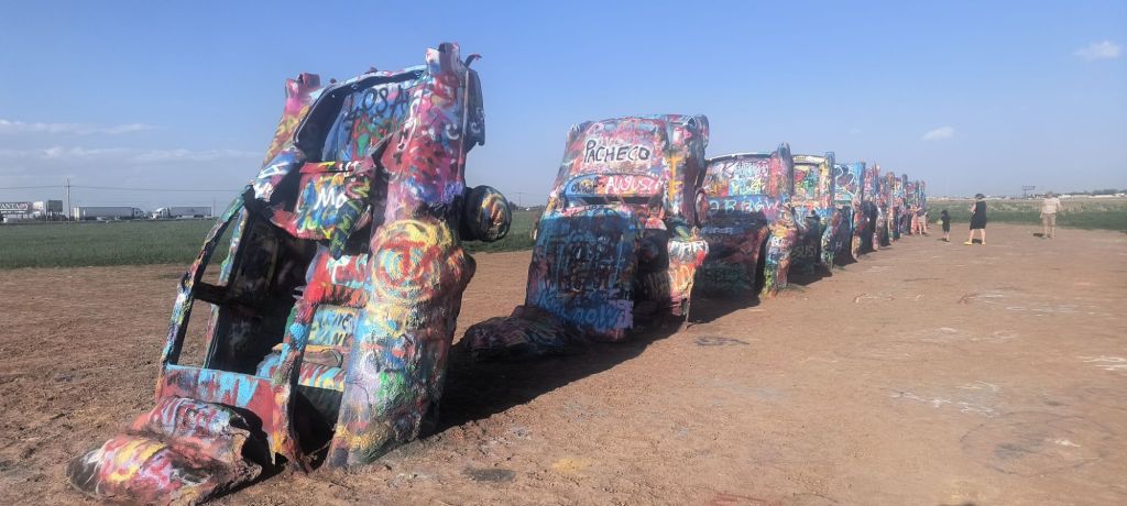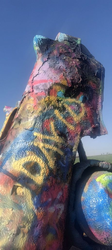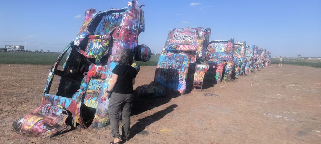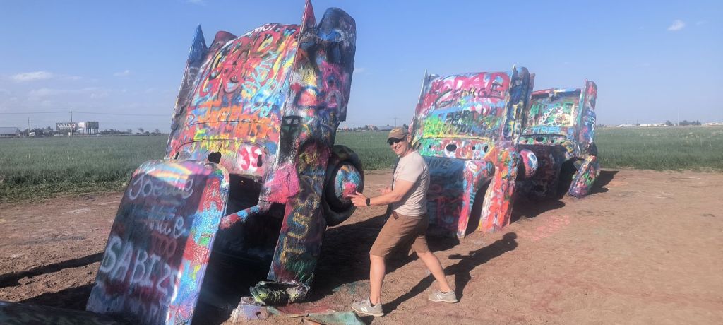 We finish our day in Amarillo, Texas, and make it to the infamous Cadillac Ranch, a 1974 art installation of ten well graffiti’ed Cadillacs seemingly dropped from the sky, which is now a must-see stop even if it wasn’t ever part of route 66. We arrive just before sunset after a long day travelling and we are a bit tired. Siri has found out that you are encouraged to add to the graffiti, but can only use spray paint. Fortunately, you can buy it onsite. I choose hot pink and off we go.