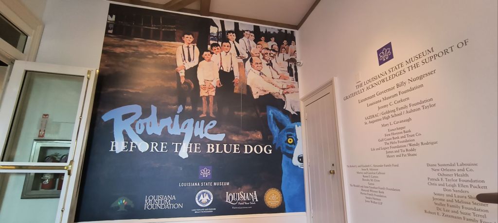 Jackson Square is unusually vacant at noonThe built in street gutters next to the cathedral were getting their full use todayDon’t step off the sidewalk – maybe a jump might get you to a little less wet groundThe gutters were making nice waterfalls into the streetsWe stopped for beignets – the official state doughnut – a French Inspired Creole pastry meant to be eaten for breakfast, but really good at any time of day.Of course there are stern wheelers on the Mississippi A monument to immigrants, on the waterfront, celebrating their contribution to the city and the countryGeneral Andrew Jackson figures prominently in New Orleans, mainly for his victory in the Battle Of New Orleans where he successfully defended the city by creating a coalition of free blacks, Cajun, creole and native Americans to defeat the larger British forces. This later president is also known for defying the courts and forcibly removing indians in the ‘trail of tears’, and according to this historic plaque, for defying courts earlier by refusing to lift martial law after his 1815 victory.Trying to drink like the locals with the ‘signature’ New Orleans rye whiskey drink The SazeracCajun artist Rodrigue is now most famous for his “Blue Dog* series – a brightly colored Cajun folklore inspired dog that became part of his paintings.The next morning, the nearby fountain now includes the sitting areaMorning on the Mississippi