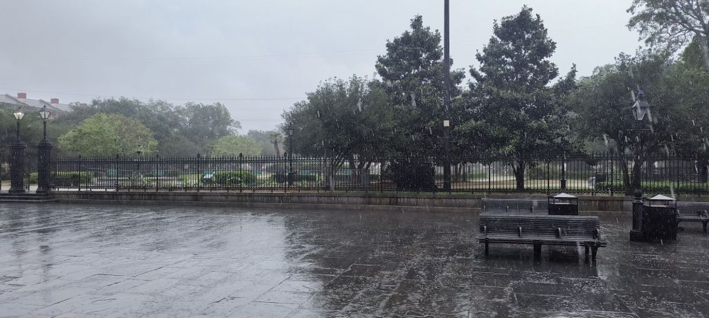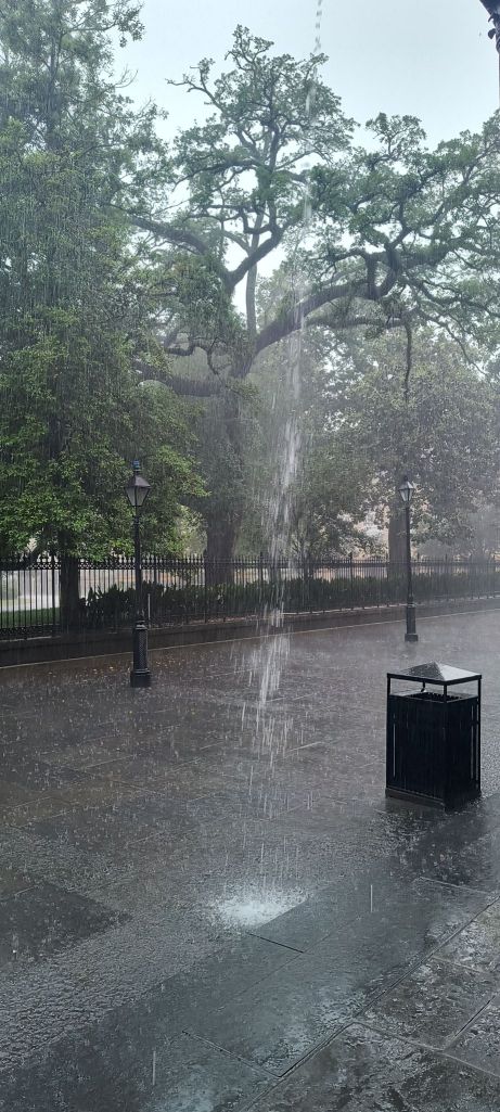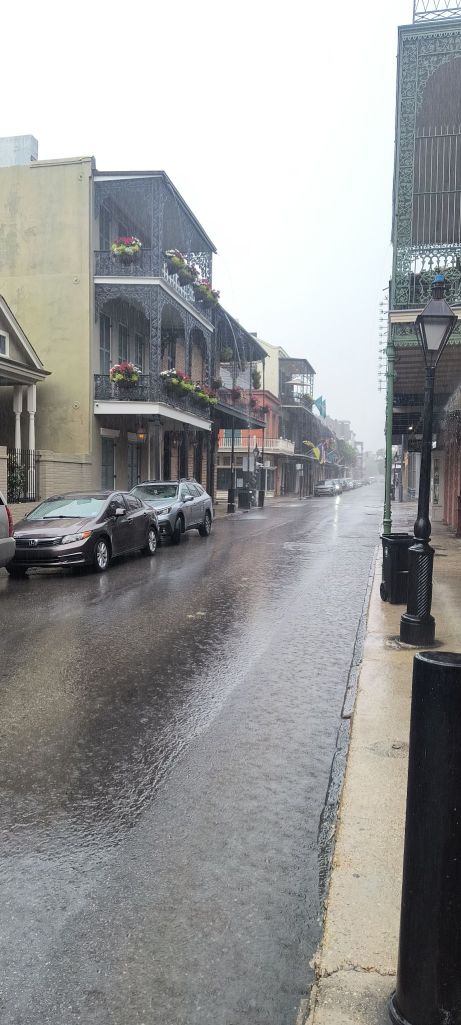 We had heard there was a thunder and lightning storm expected in the afternoon, so we planned our typical walking tour for the morning. As four (!) inches of rain fell upon us as we walked through the French Quarter, we recognized we had not planned that well. We should have done the indoor WW II museum instead.