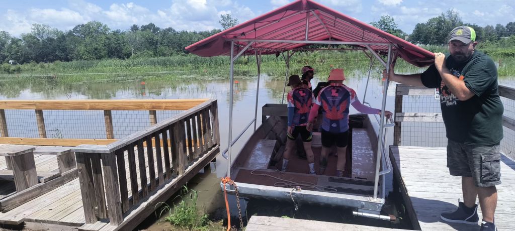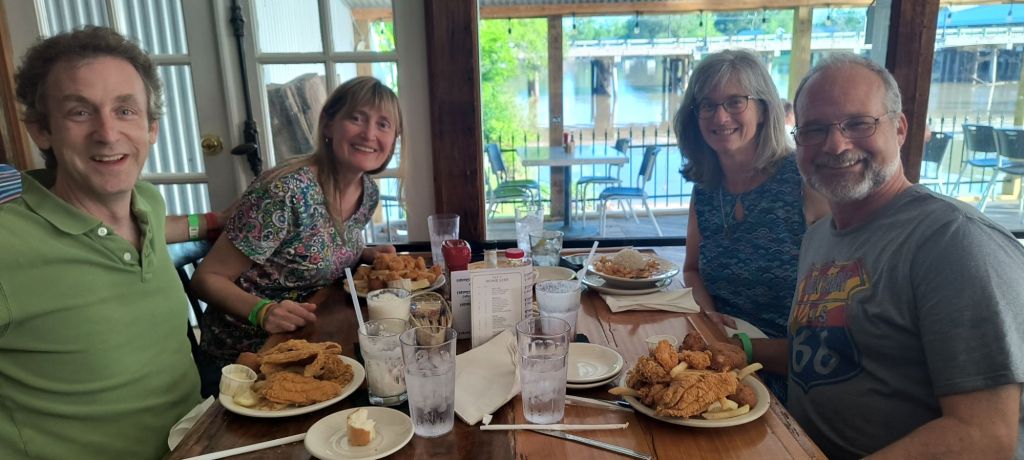 We pass through a local etouffee festival in a small town, and stop for lunch at a great pizza and brewery place. We stay a bit longer and catch up with people we have met along the way. We end the ride strong – our longest and fastest time yet. We go to dinner at the local seafood place and I order “from the swamp” platter of catfish, shrimp, crab and oysters. I skip the frog legs this time.