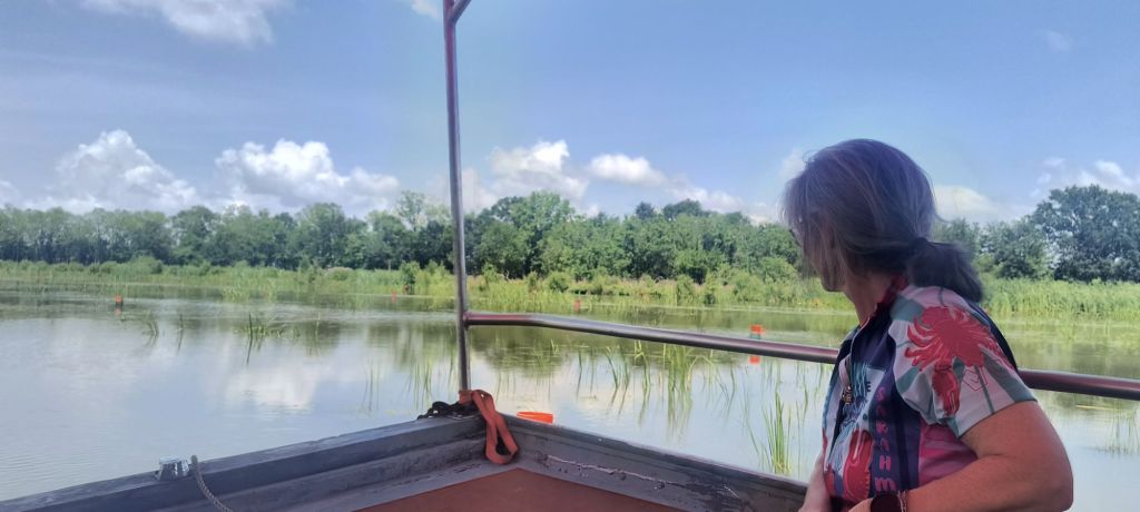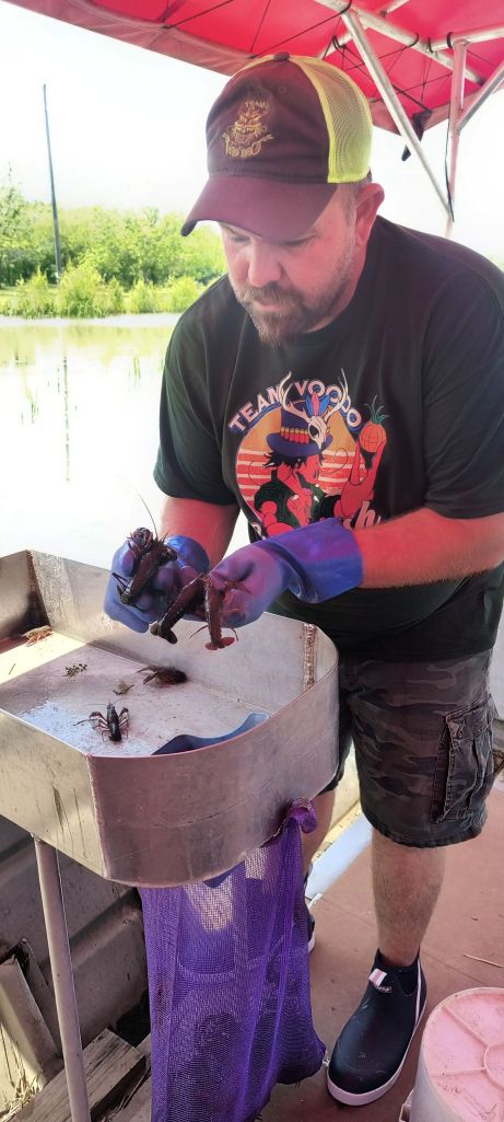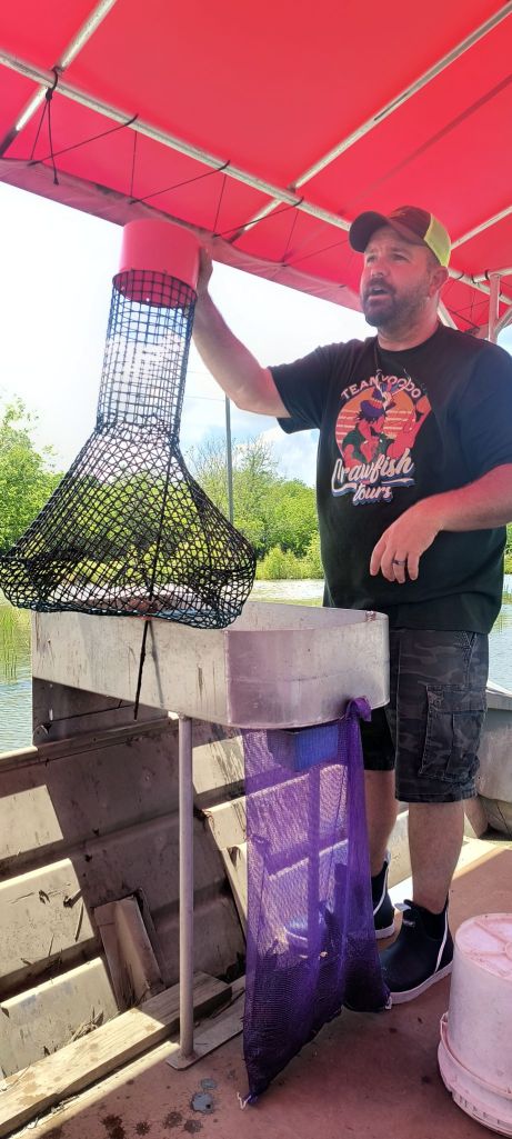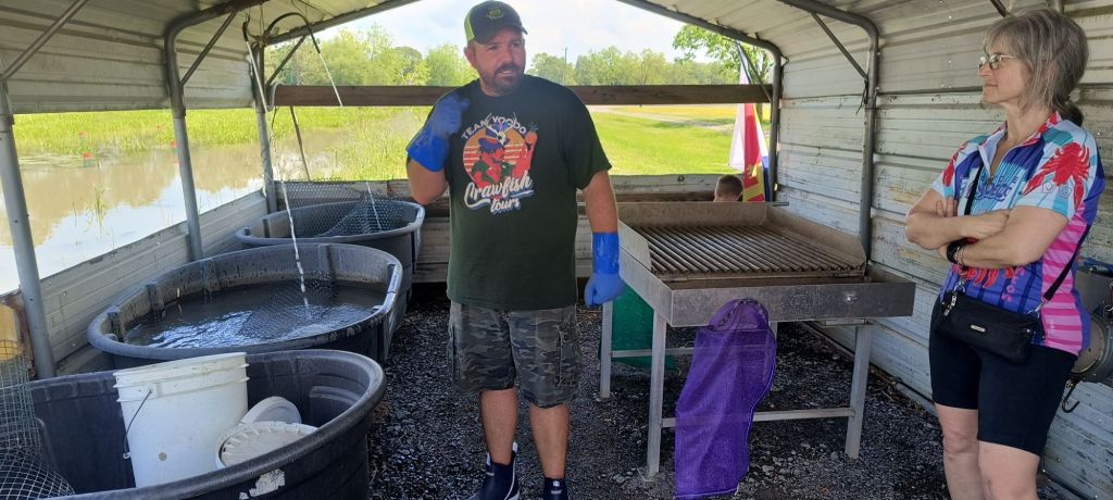 Today is the best biking so far. Nice curving country roads, large farm plantations, and fairly good side roads to ride along. The highest point is the bridge over the freeway. It is a social ride, like most of these large rides, so we meet people from Florida to California, and several locals as well. Several come back each year, while others – like us – are first timers. They come back for the culture, the good weather, excellent food and extras, such as live music every night and special tours. Today, it is the crawfish tour and we learn how you farm them in flooded rice paddies.