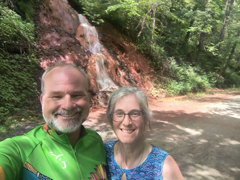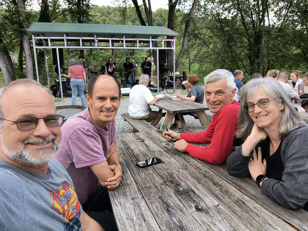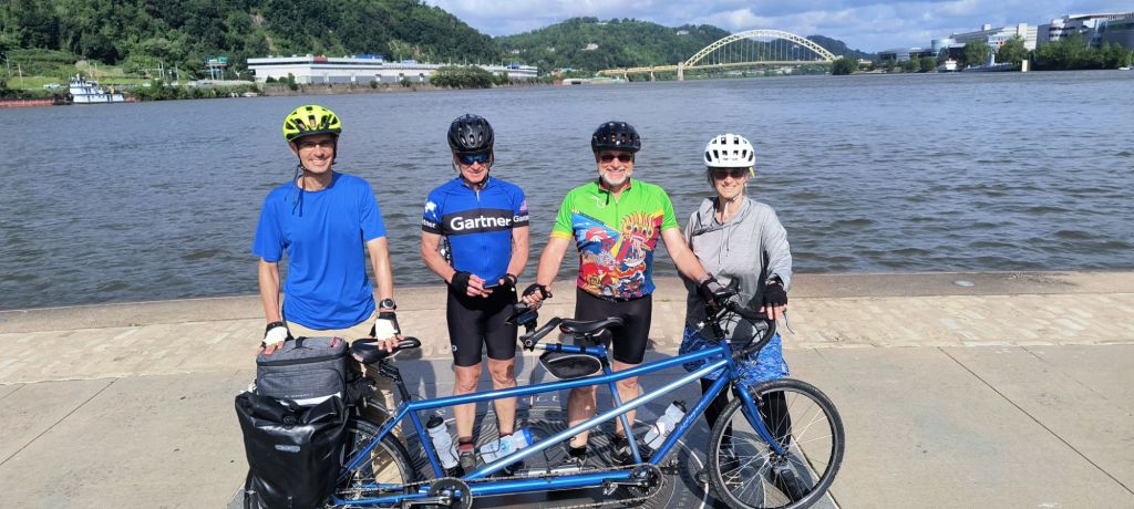 The fellowship of the four riders has begun. Siri and me on our tandem, brother-in-law David from Connecticut, and my friend Mike from California both on singles. Today we see how well we all travel together on our five-day 150-mile bike trip on the Great Alleghany Passage or as the cool people say “the GAP trail.” It is a rail to trail ride that is a slight rise most of the way with a great downhill planned on the last day as we crest the Eastern Continental divide. It is forecast to be sunny and clear, no flood warnings at all, so no wading required. We have packed our bike bags and sent forward one carryon that will arrive each night at our bed and breakfast accommodations. Not exactly roughing it.