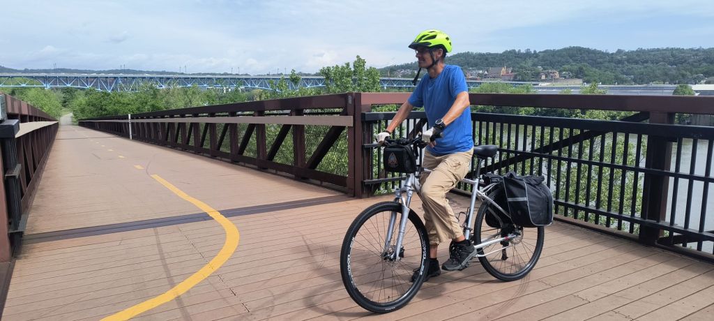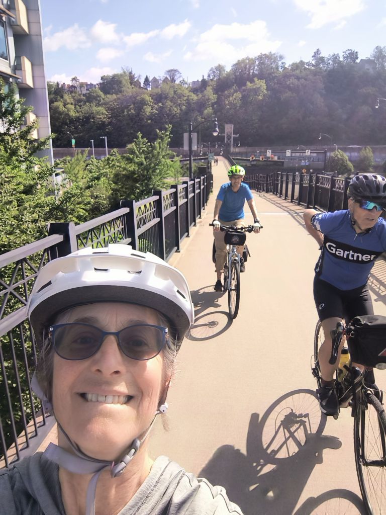 We bike to the start at the Three Rivers Point Park in downtown Pittsburgh on a sunny morning with a good headwind to make it more of a challenge. It is a well used paved trail and we meet several runners, walkers and bikers that have joined us early on this weekend morning. We pass by old steel plants, pump houses, across a couple ‘hot metal’ bridges and soon the city fades away into suburbs into a winding river and forests.