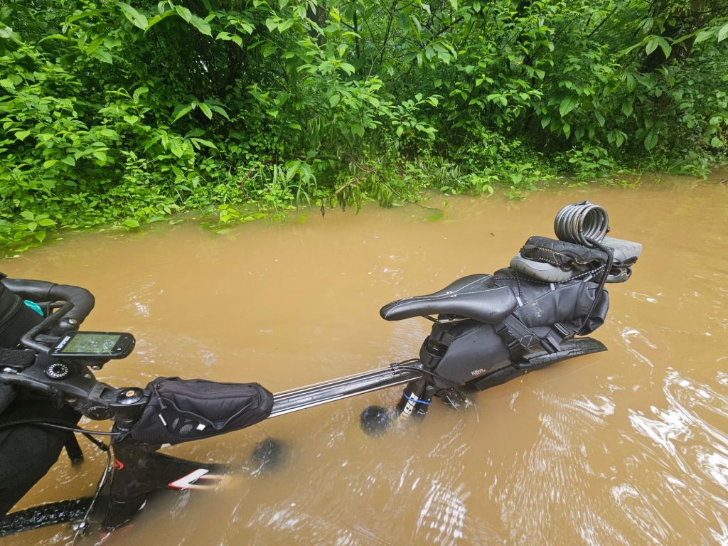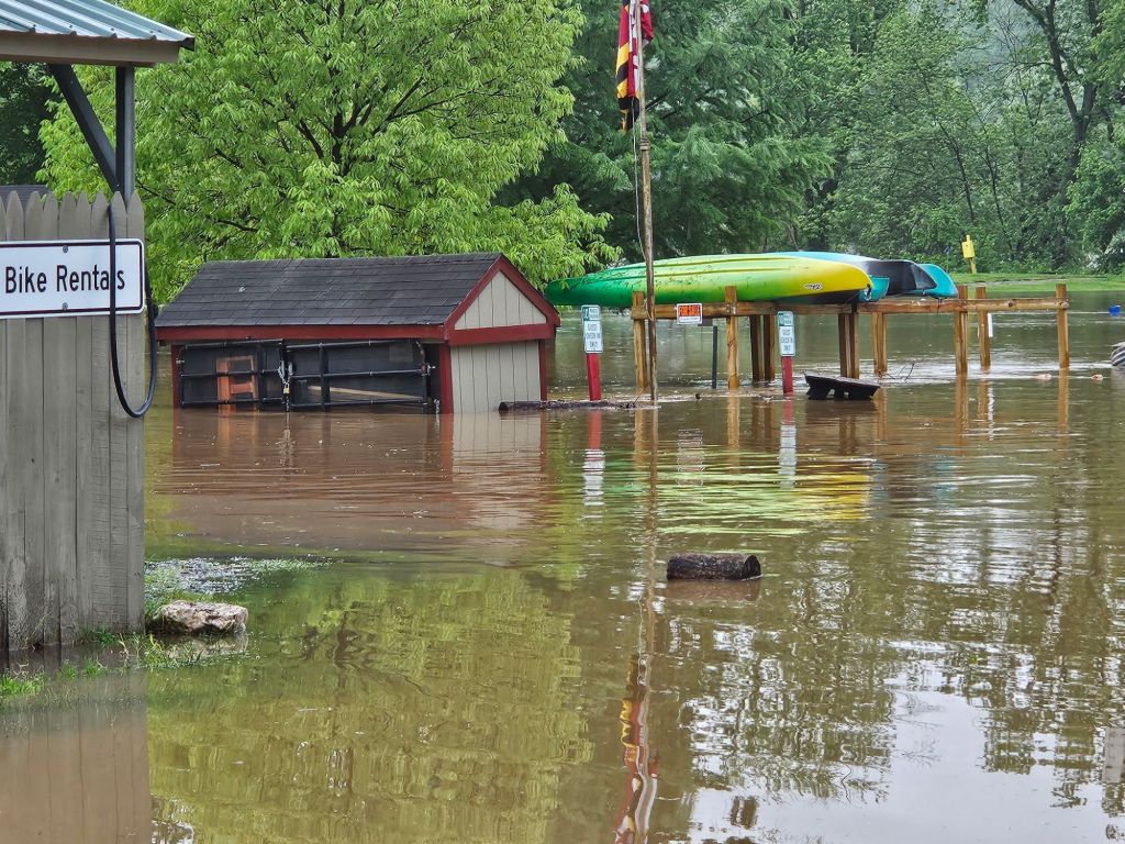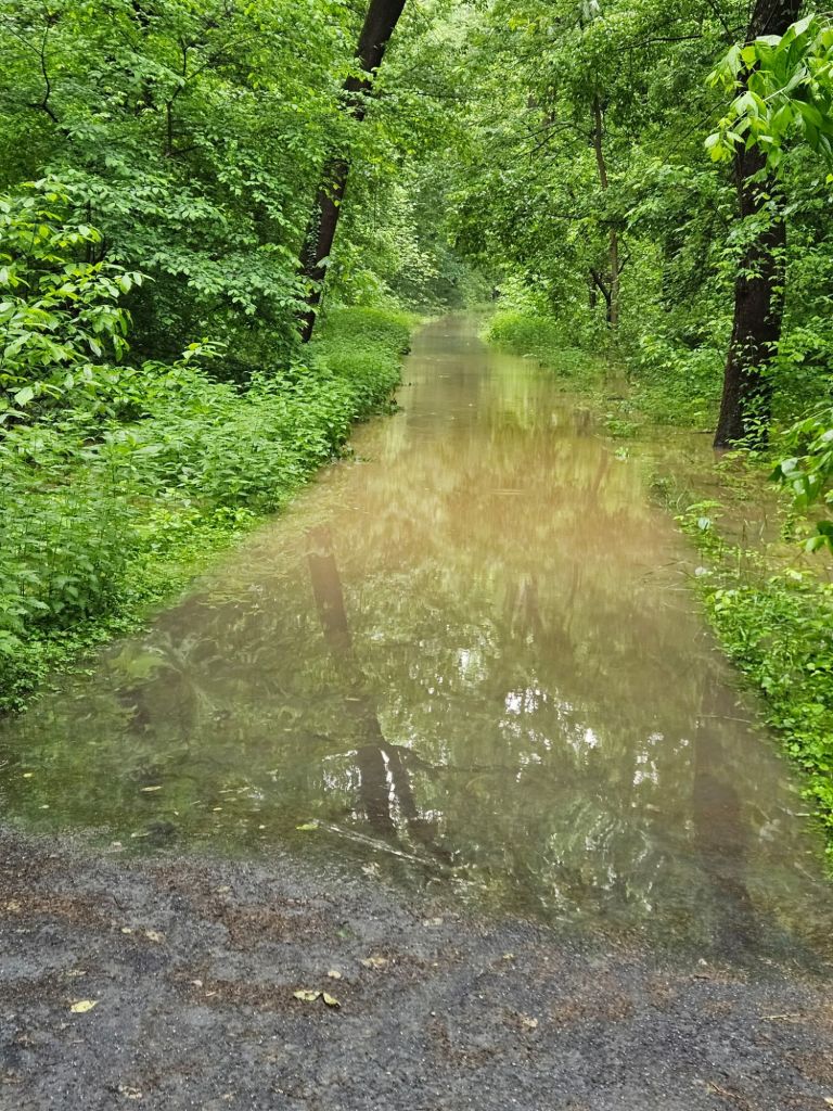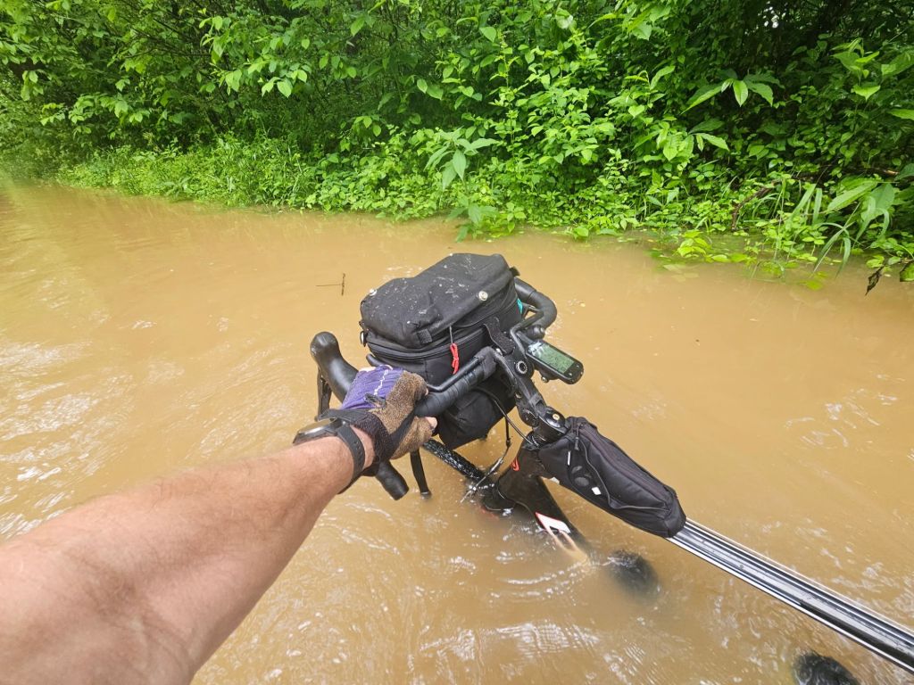 The second day on the trail he biked through rain the whole way, the fourth and final day he biked from near Harper’s Ferry to DC with the Potomac at record high conditions. He literally was up to his chest wading through flood waters over the trail. He found out he could bike through water that was ‘only’ 3 feet high, just up to his seat and his top bar. We offered to pick him up along the way, but he was already in so far, he was determined to finish the ride. Fortunately, he did make it and he was all in one piece. He was exhausted and his bike may need a lot of help after being submerged for several miles. That evening we learn that several people needed to be rescued from the flood waters, he was grateful not to be among them.