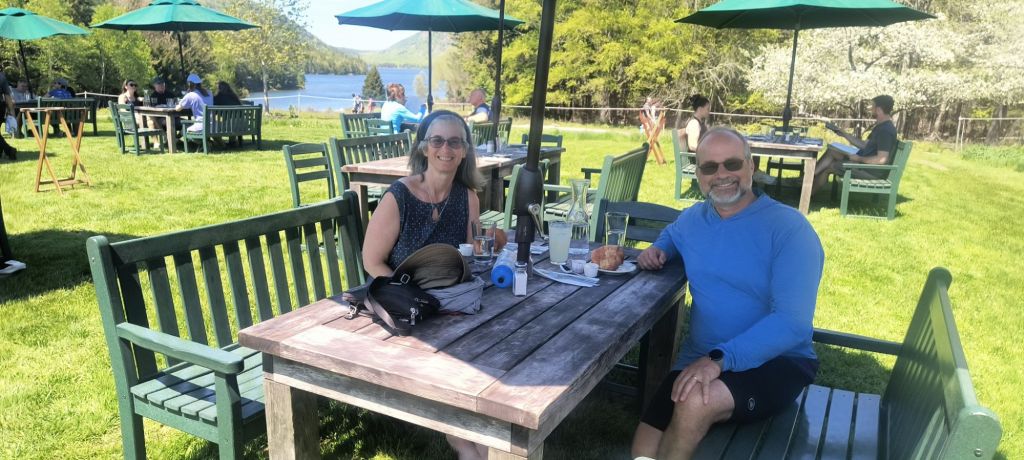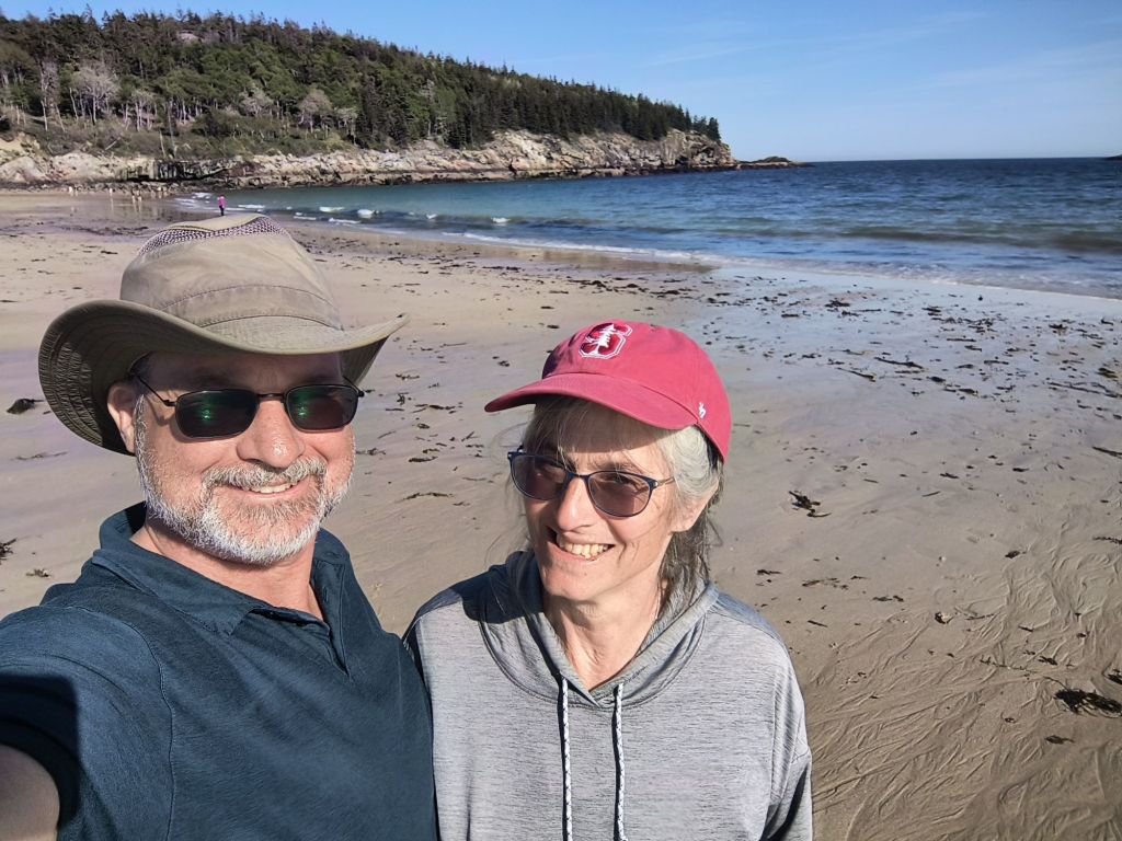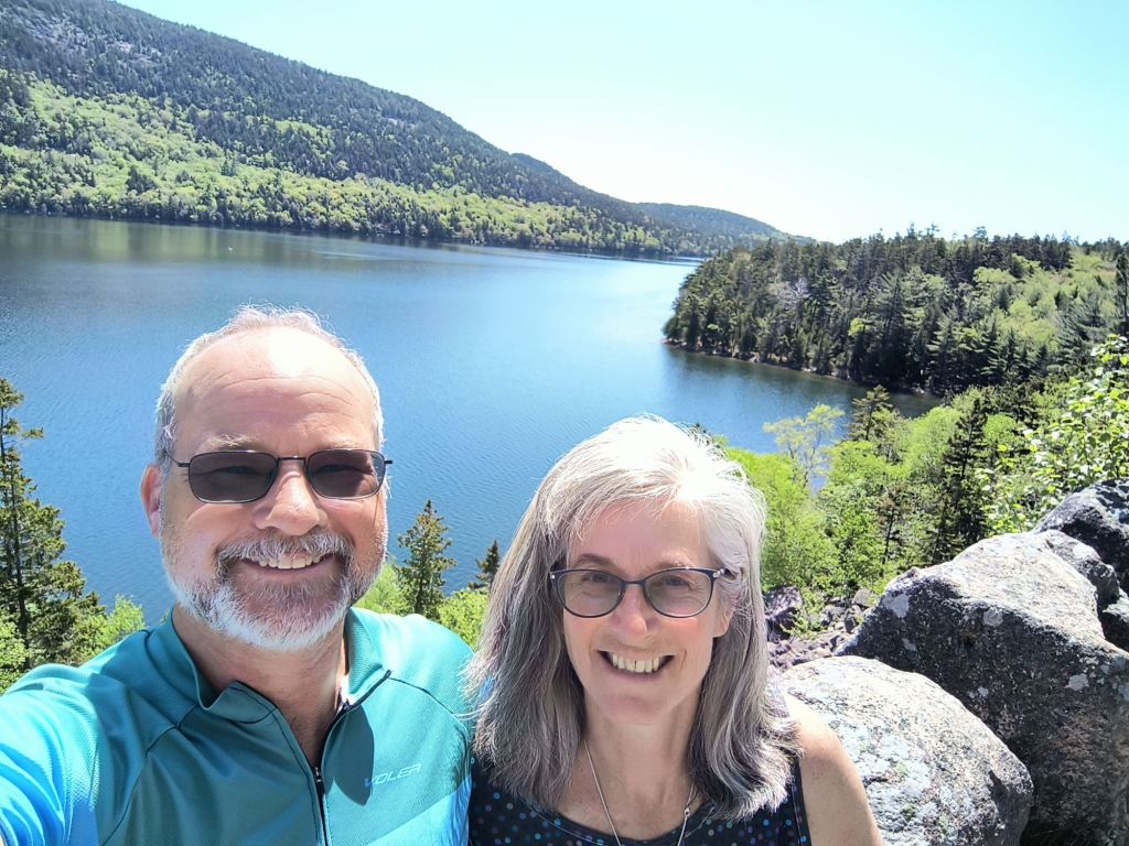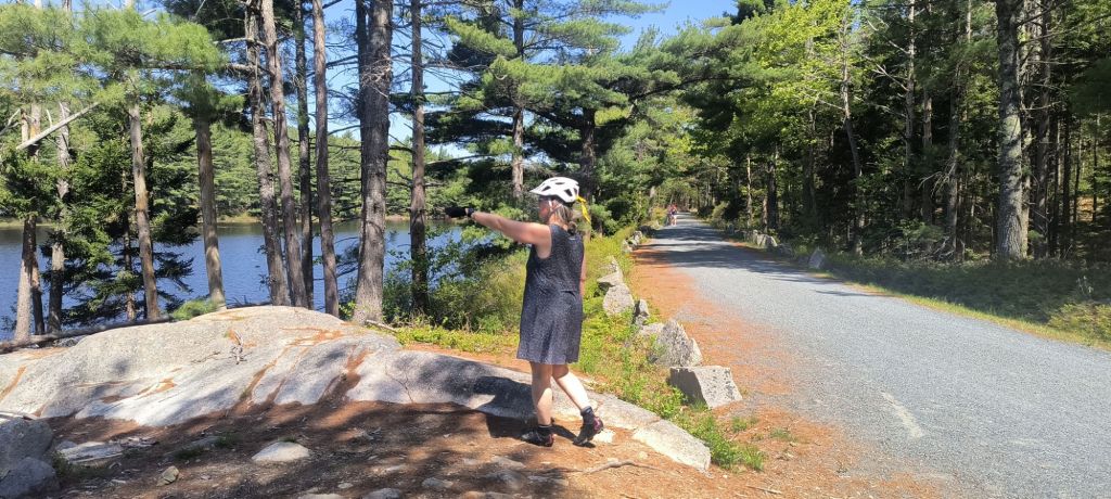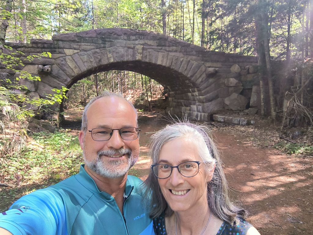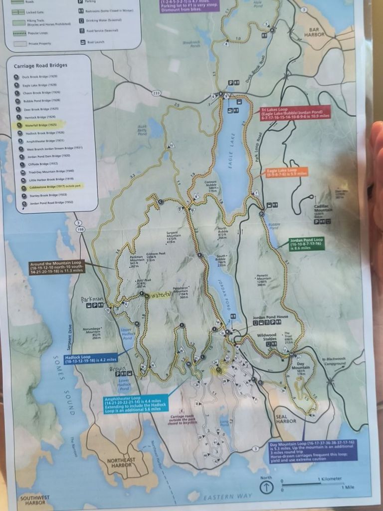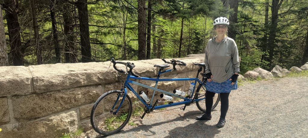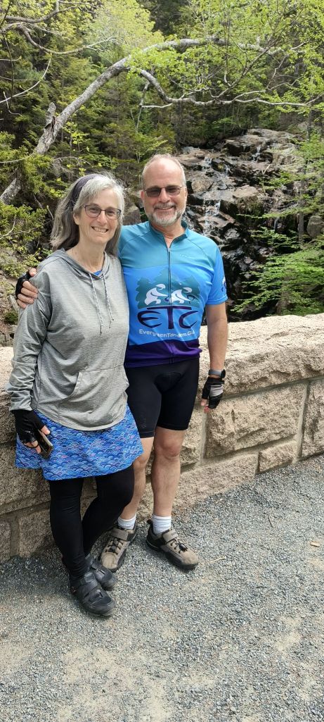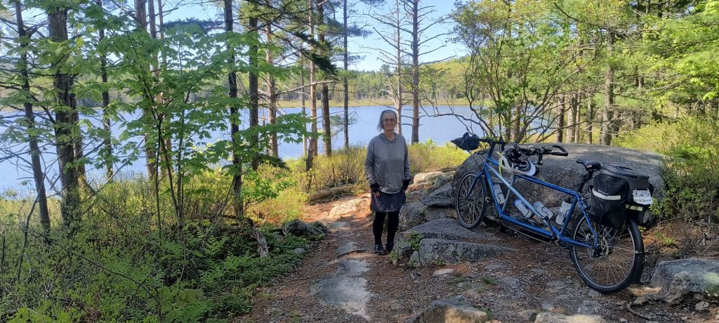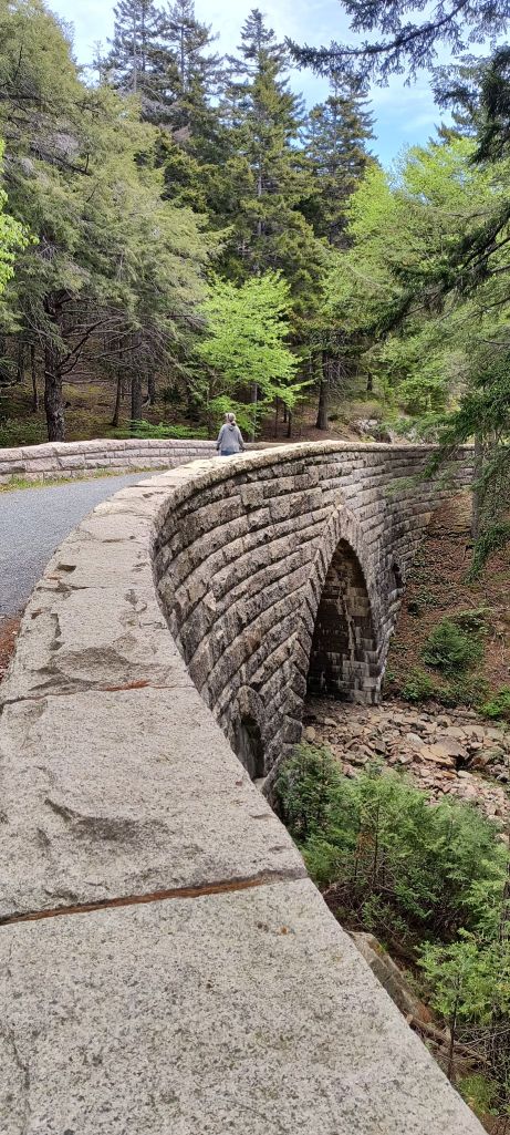 One of our main ideas in Acadia was to bicycle the carriage roads which are a unique aspect of this park. These were created by Rockefeller Jr. for his own horse drawn carriages and then were donated to create the park. They are now a bicyclist’s paradise. Though biker beware – as the ranger told us, none of them are flat, and she was right. Lots of ups and downs on well packed wide roads (enough for two horse carriages to pass). It was like hiking through the forest – just a lot faster on a bicycle – except of course when you went up a steep hill.