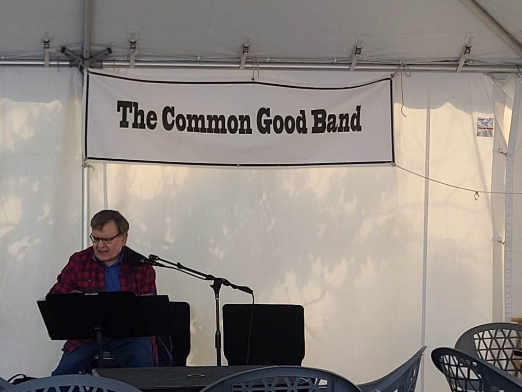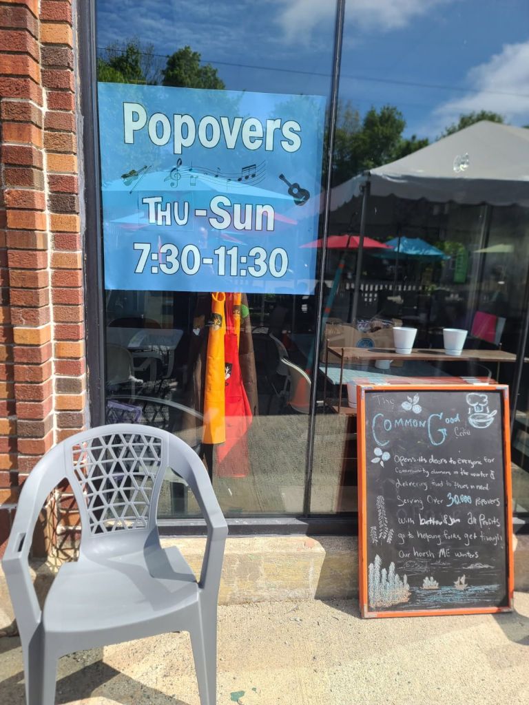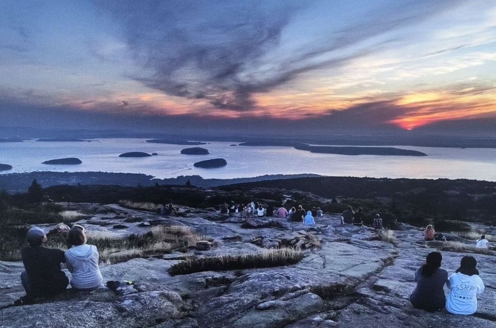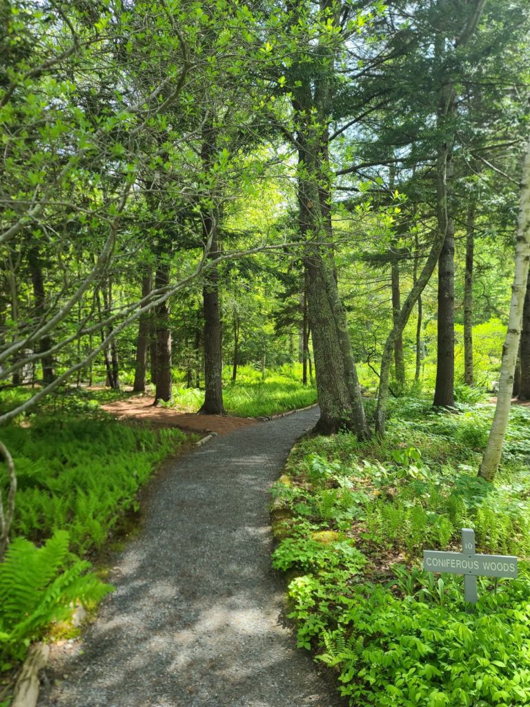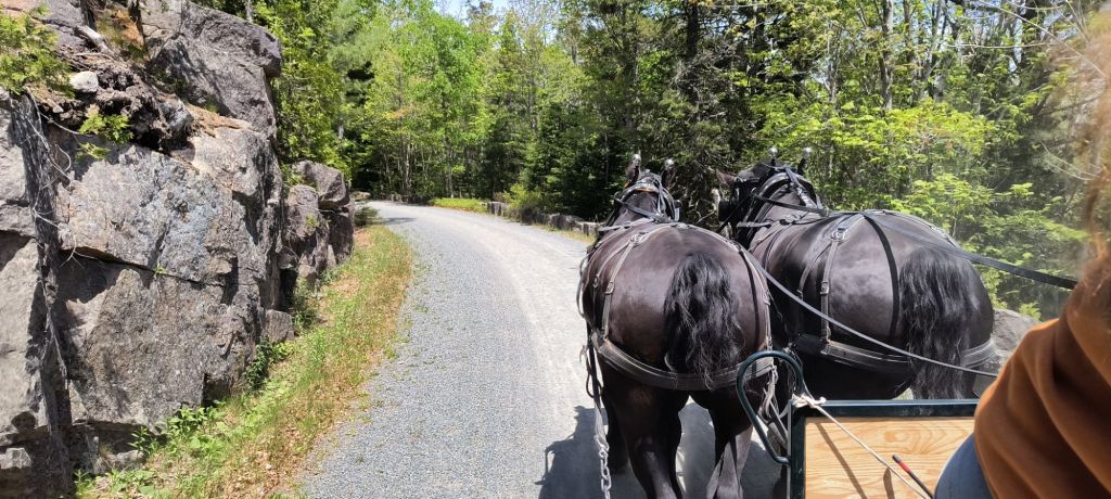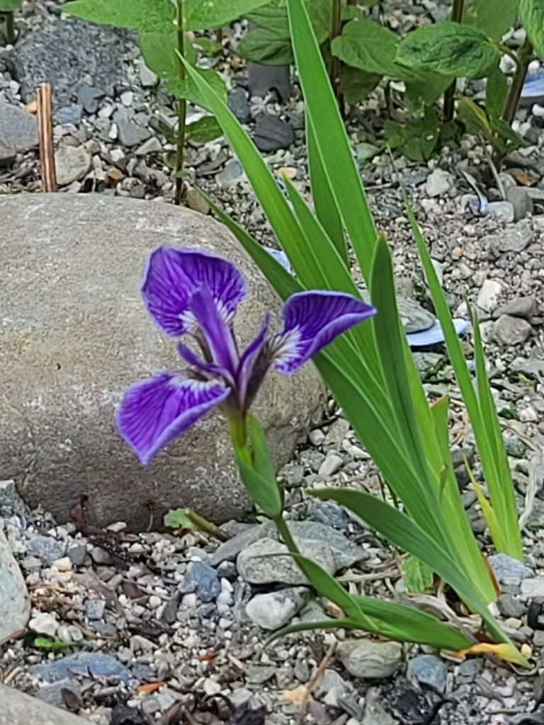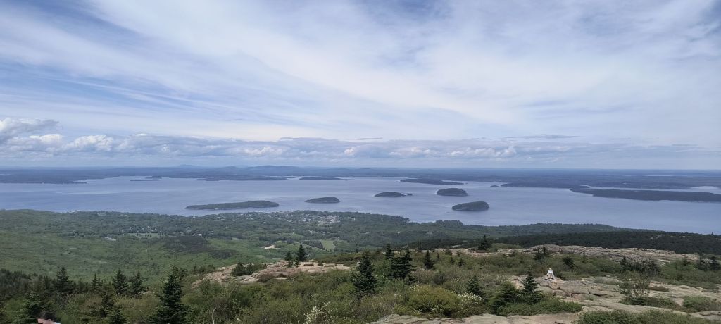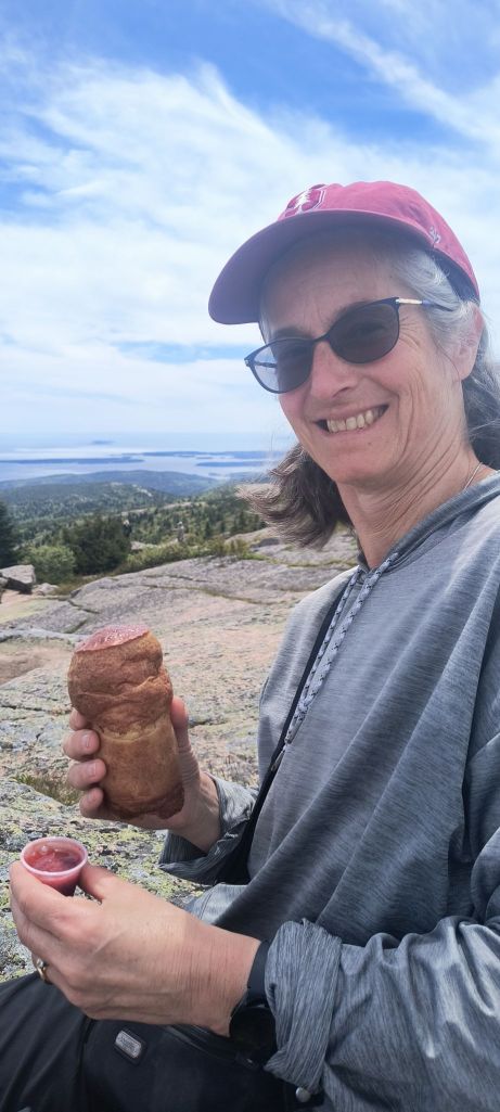 Found the “Common Good” cafe – a food pantry run by volunteers – provide homemade popovers with free music four days a week as a fundraiser The amazing volunteers making the popovers and homemade jamsThe live music entertainment – country songs on the ukulele today and a full band every Sunday morningOur carriage arrives Our view of the carriage roads- a bit easier than our bike riding yesterdayCadillac mountain – the tallest mountain on the eastern seaboardEnjoying our popovers to go at the summit – with homemade strawberry jamThis is the ‘first light’ in the US (taken from a poster)Our actual view this morning – didn’t make it for the very early sunrise Relaxing at the topStopped at the “Wild Gardens” the park nursery which showed a much more lush landscape than what we saw on our bike rides – we wondered where these plants were hidingThe Maine Coast is quite the rocky shoreline – maybe even more so than the northwest.Tried tidepooling – but mainly seaweed, kelp, and a few snails on the seemingly barren rock beaches – still great viewsOur wedding flower – an Iris