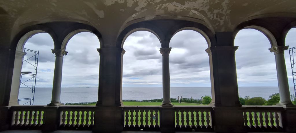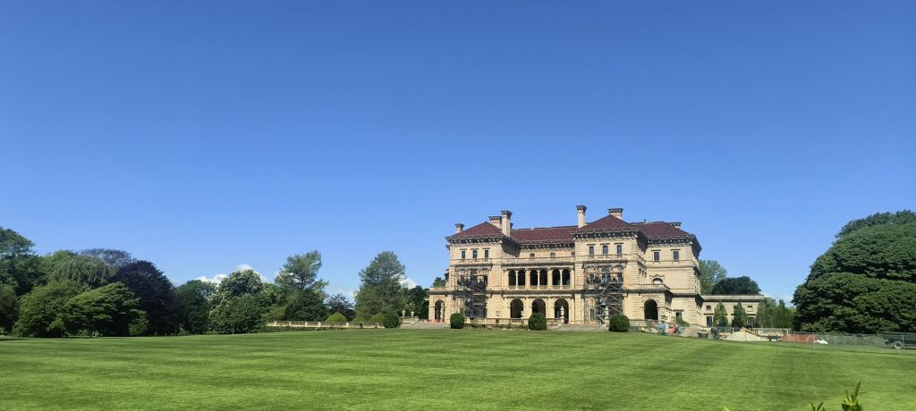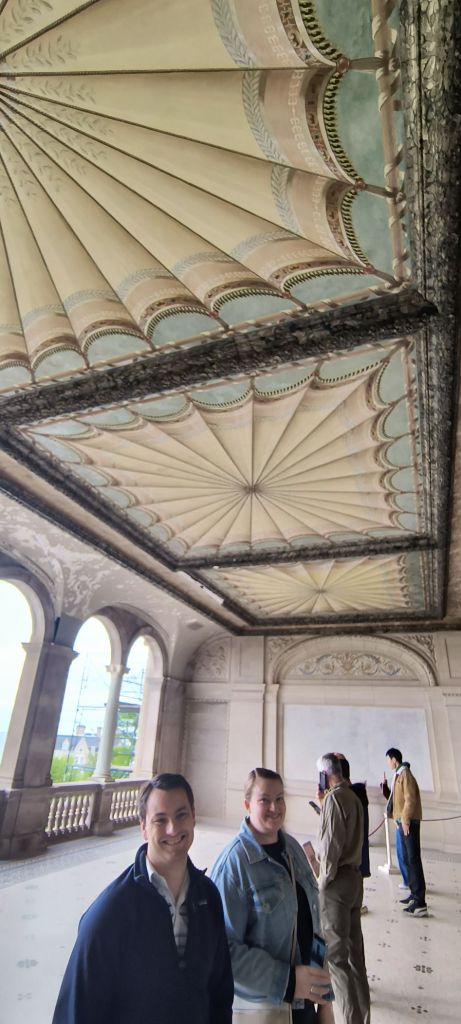 With this introduction, we began our “Gilded Age Tour” of The Breakers – the Vanderbilt’s family’s summer home that is built like an Italian-French Villa that is famous for being one of the largest residences in America. It has 70 rooms and is over 140,000 square feet. It is like Downtown Abbey on steroids. It is near where the Great Gatsby was filmed. It is an amazingly beautiful structure that has gold inlays and intricate mosaics everywhere, a grand ballroom with Italian marble, the sweeping grand staircase, and of course the tremendous ocean view off Newport Rhode Island. We get to take a behind the scenes tour to see where the large staff lived on-site and the more modest family bedrooms.
