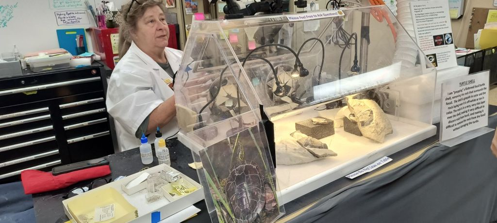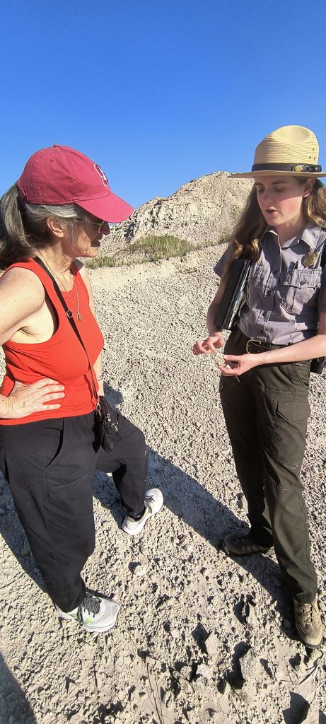 Within just a few minutes, the energetic younger ranger had me convinced that the Badlands are actually pretty amazing. The grasslands, which used to cover all of the central US and even went into North Carolina, are now almost gone and only 2% remains in public protection – like this park. Walking just across the road from the visitors center we encountered several different types of grasses, several native plants and beautiful bright flowers. There we sooo many. I had thought the plain grasses were all the same, but in reality there are over a dozen types of grasses and other plants that formed the Great Plains. Did you know that plain grasses are like icebergs, with over 2/3 of the plant underground in their roots? With the 1 inch of erosion per year, there are lots of opportunities to find fossils – and sure enough we did! Badlands were pretty cool – just need better marketing – maybe start with the name.