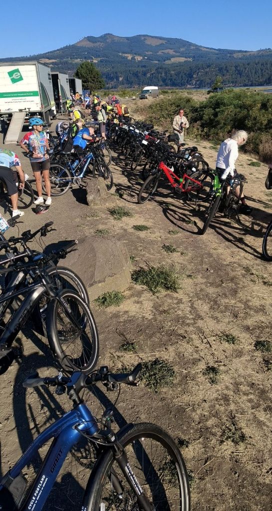 We are especially excited for today’s ride since we just tried a part of it out a month ago with my sister, Carolyn, and her husband, John, who live nearby in Portland. It is one of their favorite rides – especially since it not only has breathtaking gorge views and tunnels (!), but you get to stop at a winery known for their Spanish style wines. Unfortunately, we will have to skip the wine tasting – at least while riding today.
