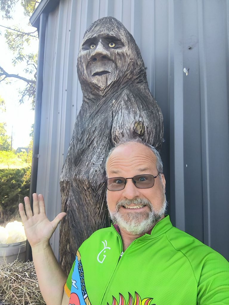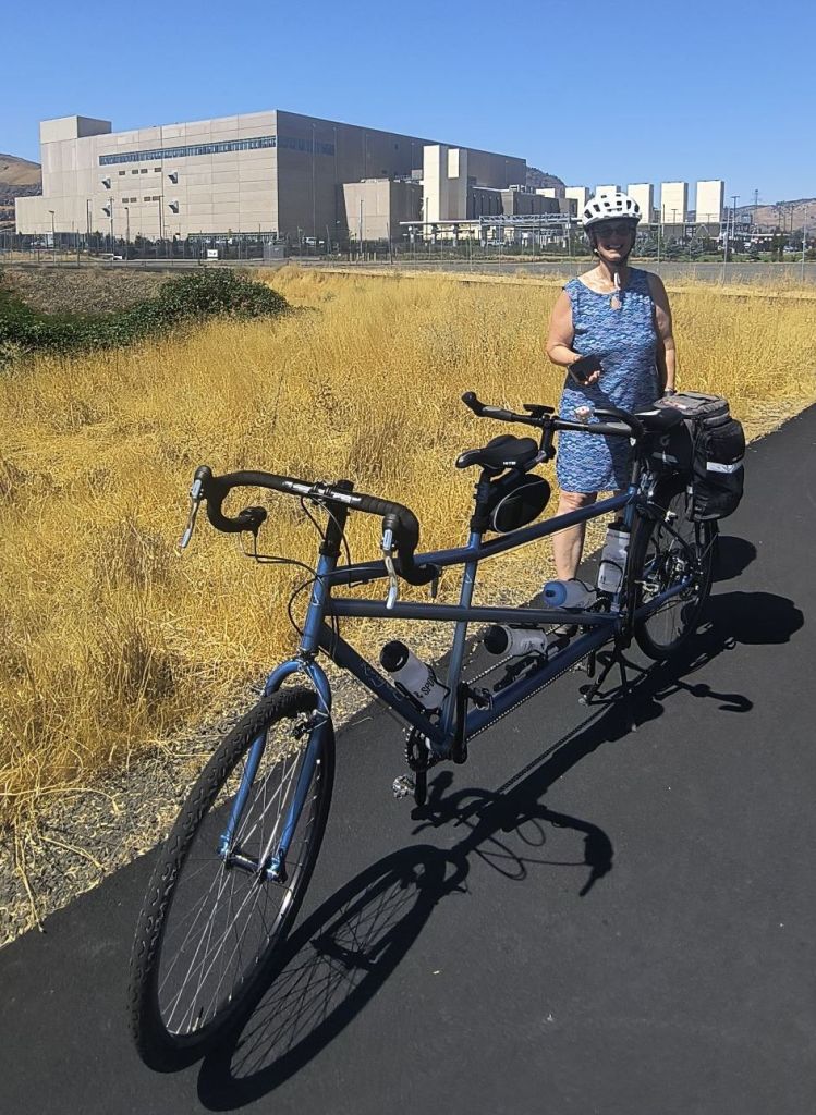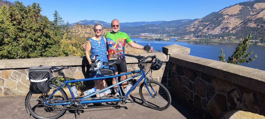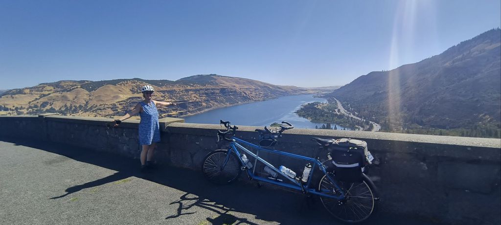 We leave right from the boat which is moored on the actual rock jetty of the marina. We are joined by Doug and Linda, another tandem couple from Dayton, Ohio, who have actually raced tandems – see photo evidence below. Today there is no car to help us climb out of Hood River up a steep serpentine road. We pass through the locked gate which tells us the historic highway 30 is only open to walkers and bikers. We keep climbing up through the forests which have been touched by wildfires. This whole area has been impacted by terrible fires – later in the day we will pass the Rowena fires which devastated a small community only two months earlier.