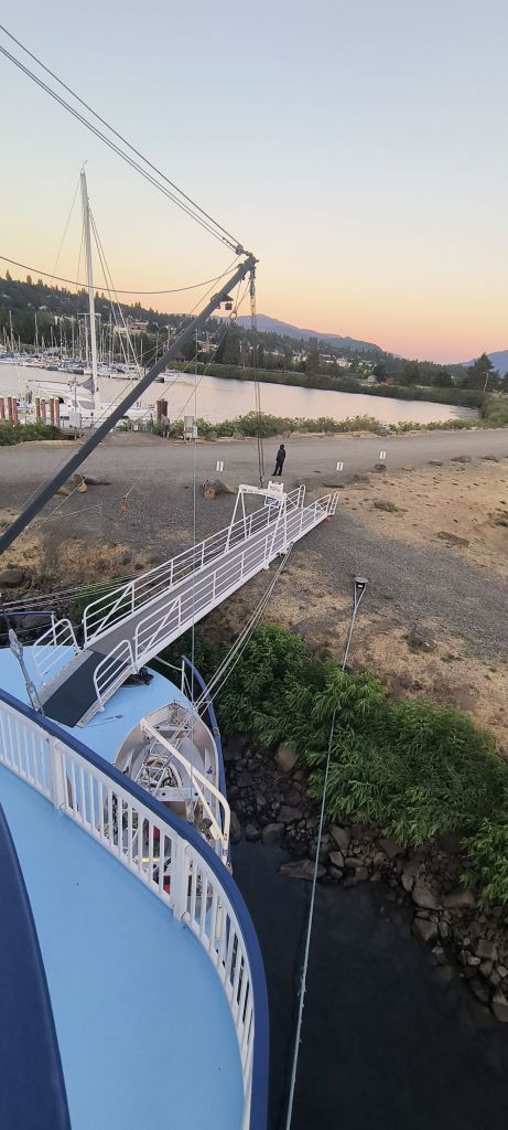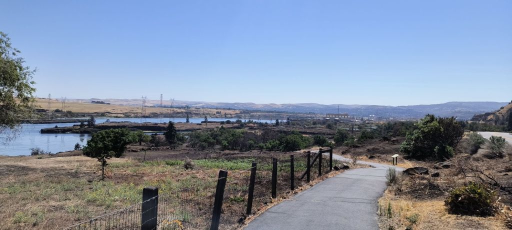 We go under the freeway, past the burned underbrush and take the river trail into The Dalles. We go by two new Google data centers right next to one of the known encampments of the Lewis and Clark expedition. Quite the timeline all in one place – from the longest native American fishing village to now high tech infrastructure because of the cheap electricity from the dams.