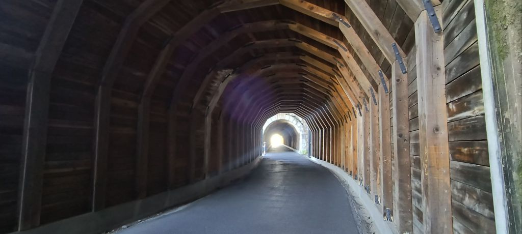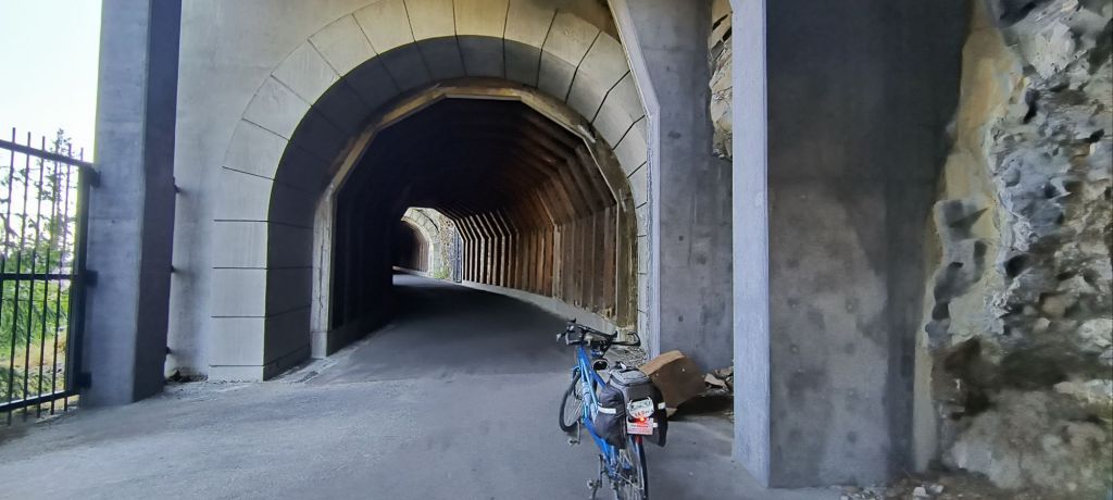 Near the top of the first hill we enter the iconic Mosier tunnels which were carved into these cliffs in 1914 and enjoy the views out the portholes cut into the sides to provide light and air. It is amazing to think that Siri’s Dad actually drove this same road – in winter – as a kid to visit his relatives in Eastern Washington. We are glad there is no snow or ice on this 90+ degree day – well we wouldn’t mind a bit of snow to help cool us down.