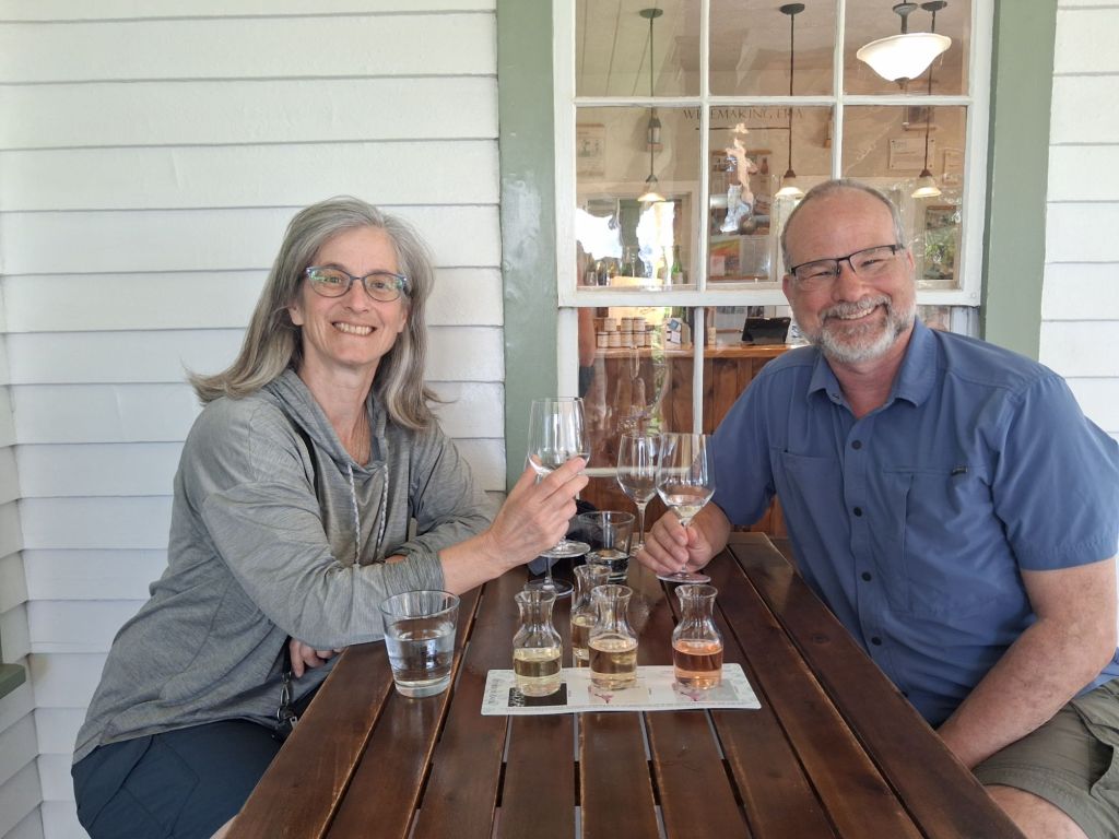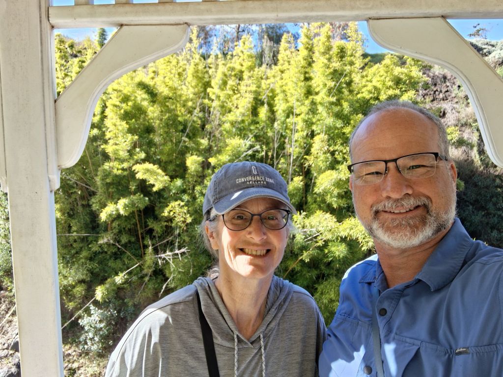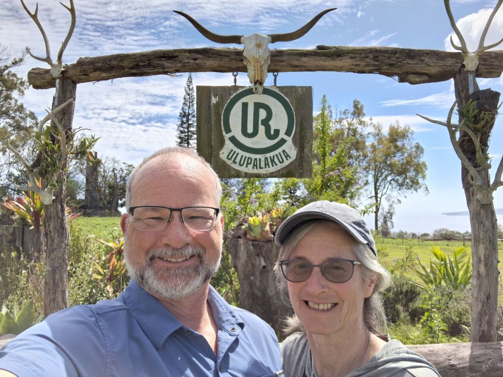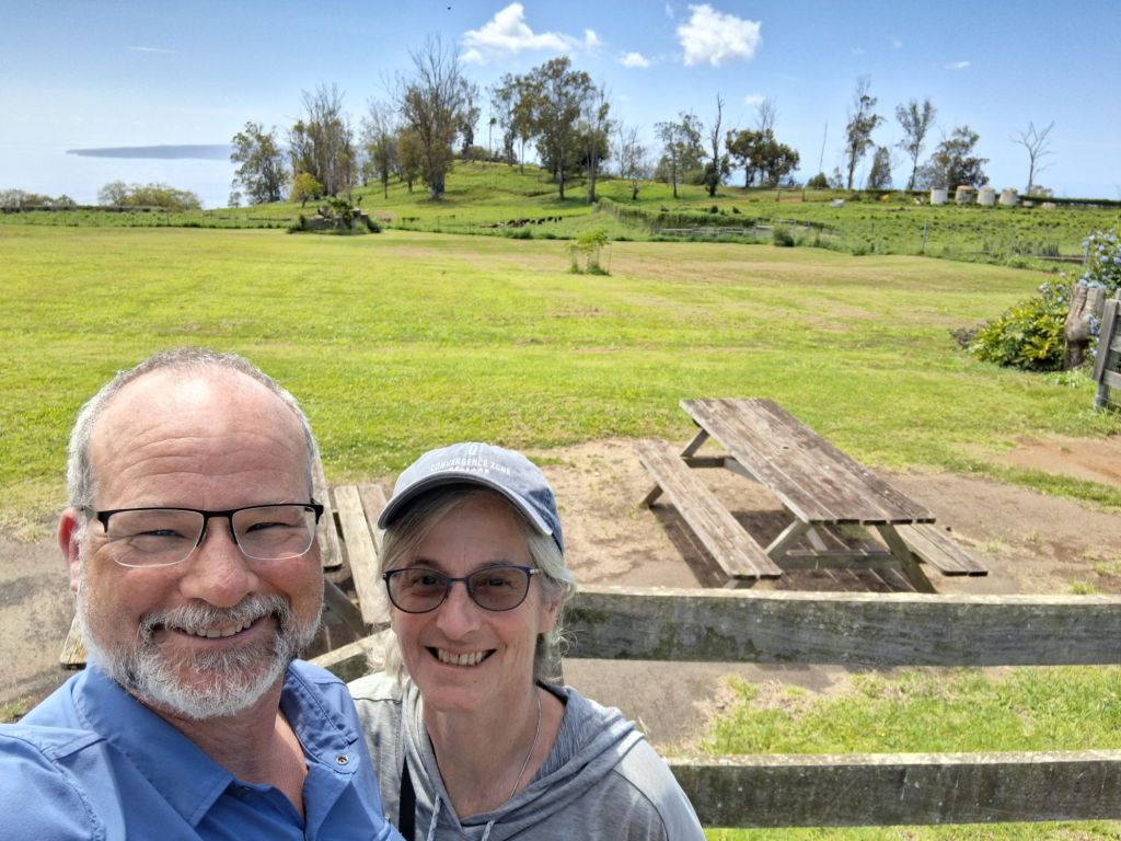 Our last major stop is Maui Wine and Ulapalakua ranch for lunch. We enjoy learning the history of the ranch – purchased by a whaling captain in the 1850’s as a sugar plantation where he entertained King Kalakaua in the 1880’s. It is now mainly a cattle ranch with the addition of wine production in the 1970’s. It was fun to taste the sparkling pineapple wine – not our favorite, but interesting to try it out. We enjoy the grand views back down the hillside to Kihei and surrounding area.