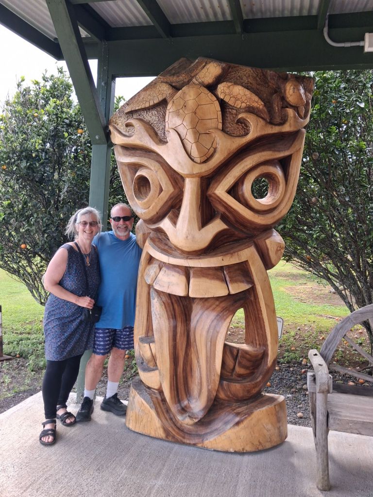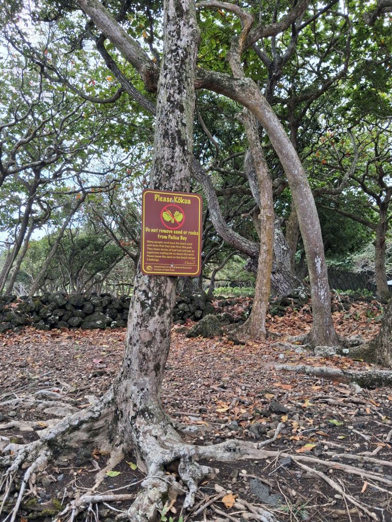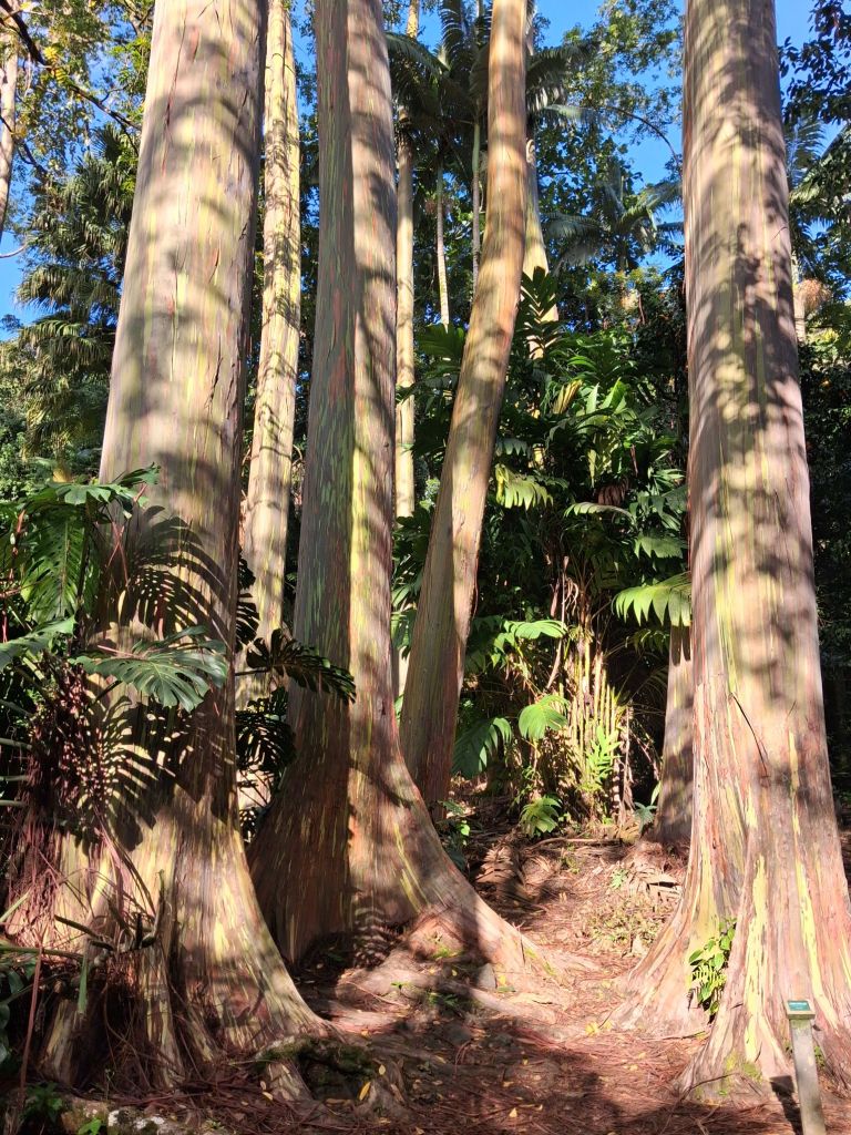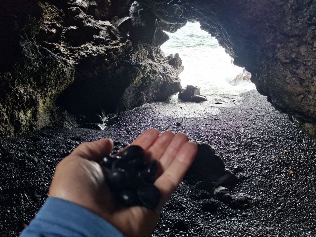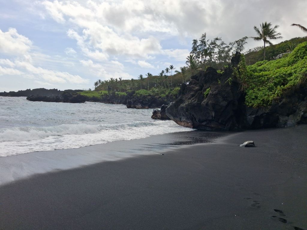 Fortunately we had downloaded a virtual tour guide, The Shaka Guide, which was fabulous. It helped curate the stops, gave suggestions and ‘best of’ ideas, a little history and had nice Hawaiian music to keep us company all day. We stopped at the rainbow eucalyptus trees and only one waterfall before making it to the black sand beach – which is quite spectacular. It is a more recent lava flow which created this unique site of deep black round rocks that then turn into this fine black sand which is pounded by the surf.