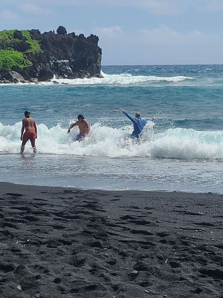 After walking through a lava tube cave and over the barren lava trails, I decided to join in the fun of also being pummeled by this surf. When a full-size wave hits it can knock you over, spin you around, and have you smacked down against the black sand. Then you get up and do it again. Of course everyone is doing this from young kids to full size adults. After several of these broad sides, we called it quits and headed along our way.