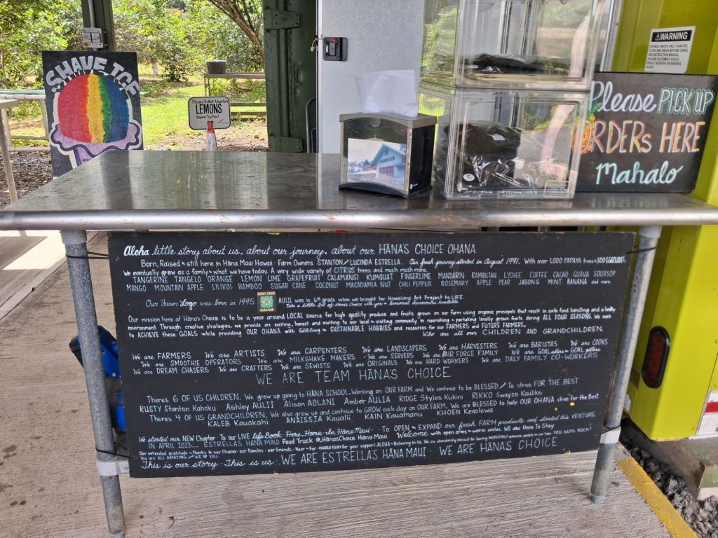 Hana town is a sleepy small community that seems to be at the end of the world. Historically, this is where King Kamehameha landed his armies to take over the island and later was the site of at least six large sugar plantations. But now it is less than a thousand people getting by with road side fruit stands, a few entrepreneurial stores and restuarants and one fancy resort and spa. We stopped at a family farm for a passion fruit smoothie and talked to the locals. This small family farm has expanded from livestock to organic produce to now citrus groves and the roaadside smoothie and shaved ice stop. They are a proud Hana family and all kids and grandkids play a part in making it work.