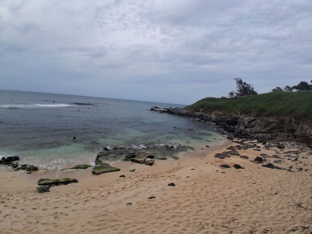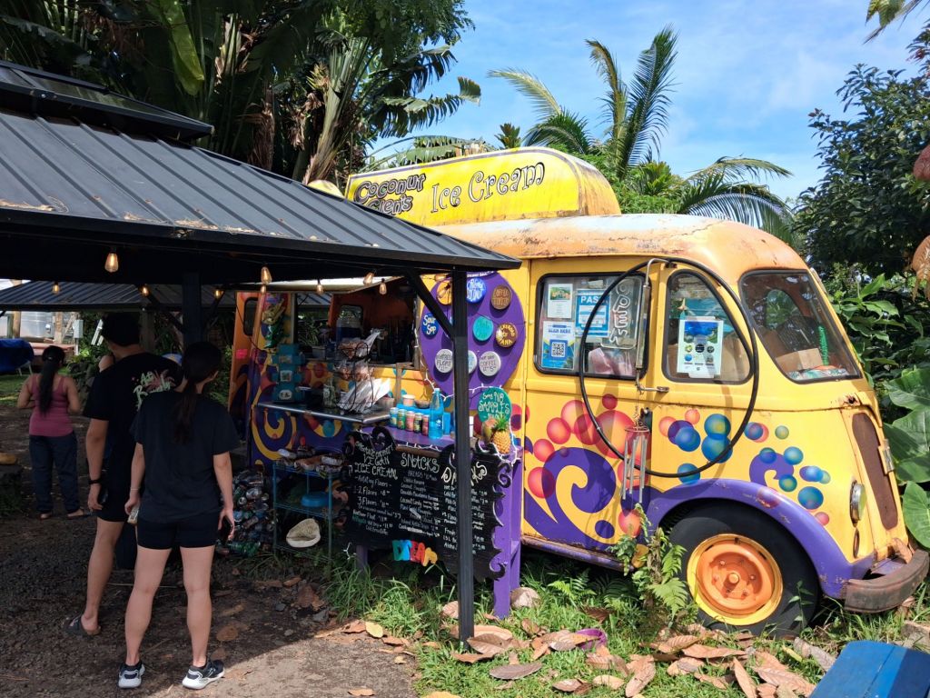 We decide to not continue on and so turnaround and head back to beat the impending storm and nightfall. We take a more leisurely pace returning, stopping for vegan passion fruit ice cream (are you seeing a theme here?), checking out the famous Jurrasic Park rock with incredible waves crashing against jungle cliffs, swimming in a waterfall, checking out the turtles and over 50 surfers at Ho’okipa park, and finally walking through the cute tourist town of Paia.