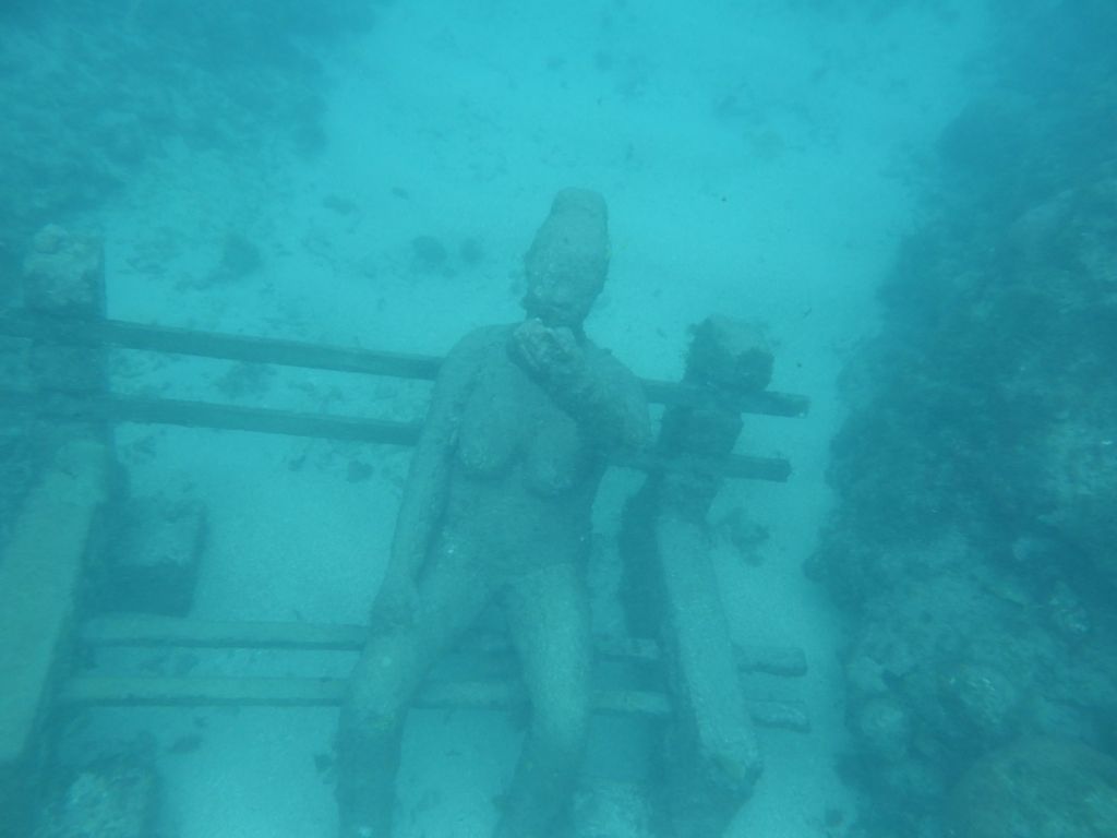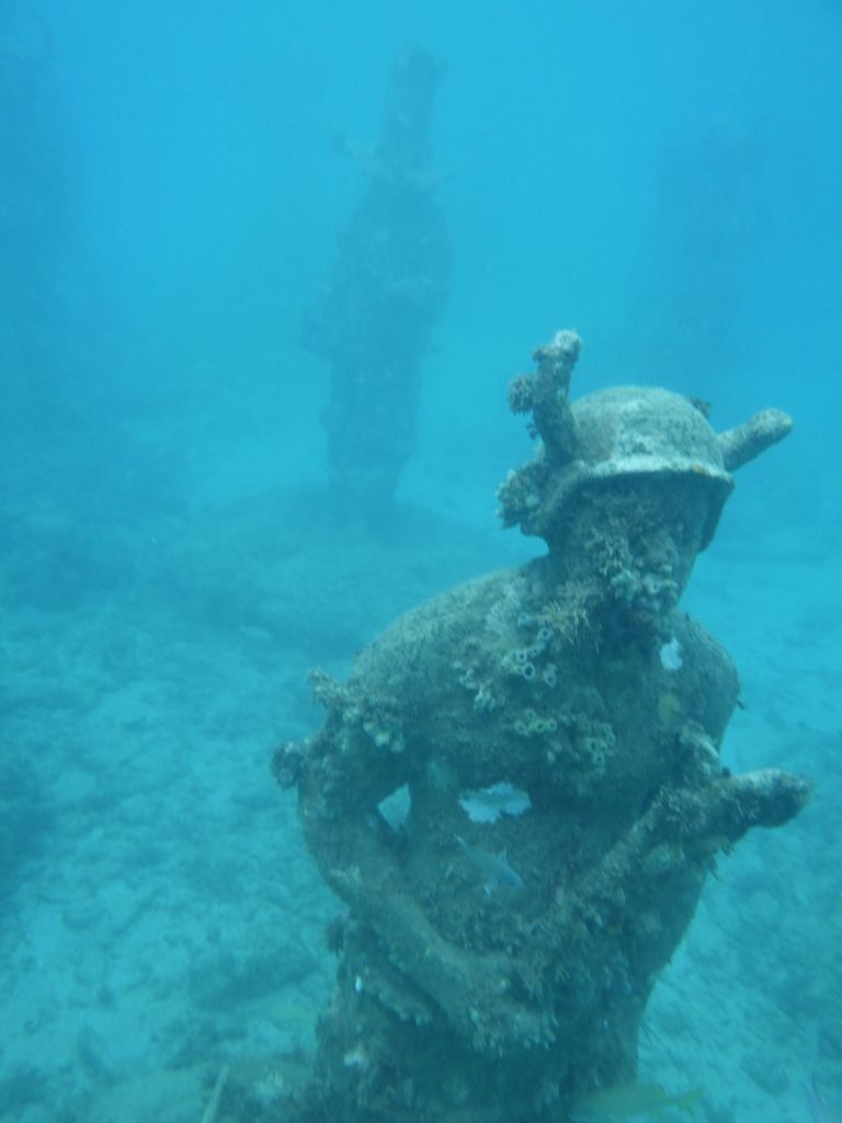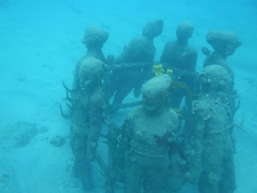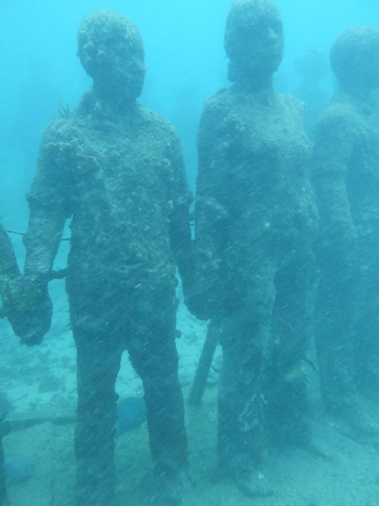Our first stop is the famous (?) first of its kind in the world (?) – our tour guide says – the underwater sculpture park. Twenty years ago a Brit wanted to open a dive shop, but he ended up building cement sculptures and placing them underwater to help repair a reef that had been damaged by Hurricane Ivan. Iit seems to be working.