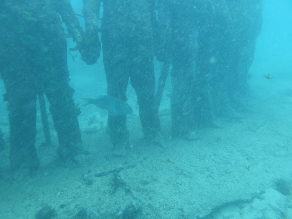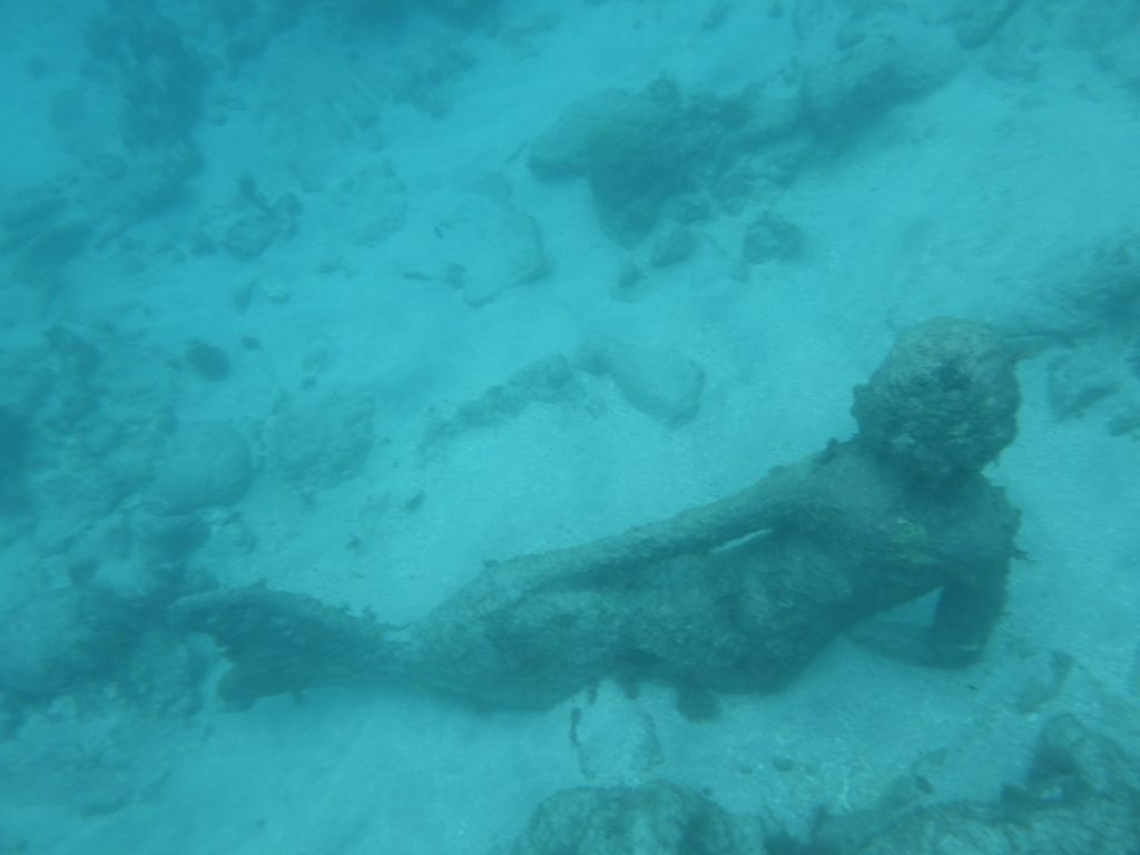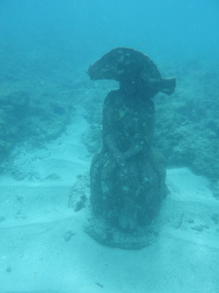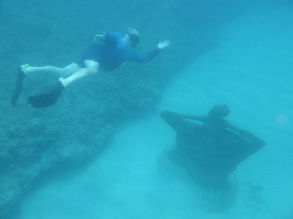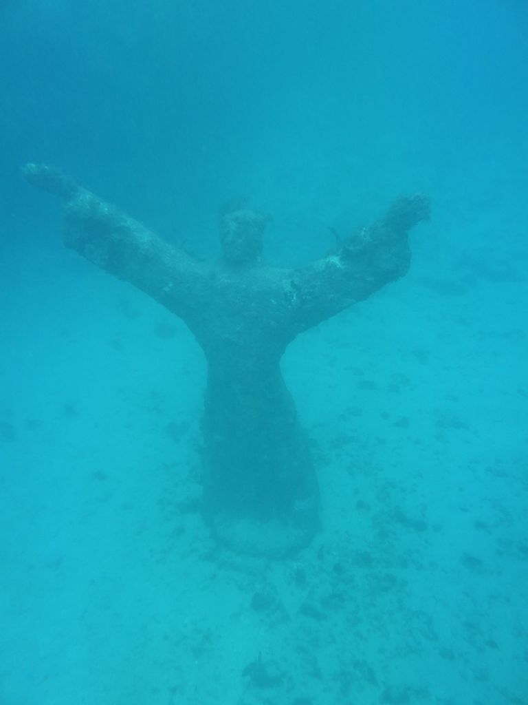 Our first stop is the famous (?) first of its kind in the world (?) – our tour guide says – the underwater sculpture park. Twenty years ago a Brit wanted to open a dive shop, but he ended up building cement sculptures and placing them underwater to help repair a reef that had been damaged by Hurricane Ivan. Iit seems to be working.