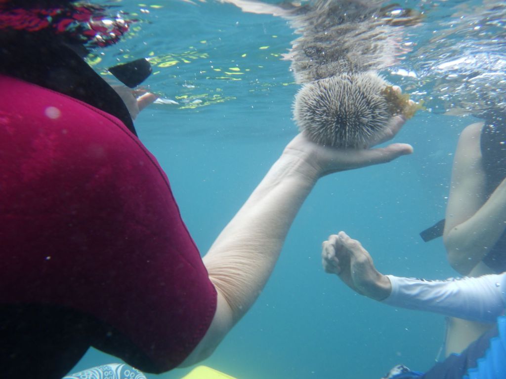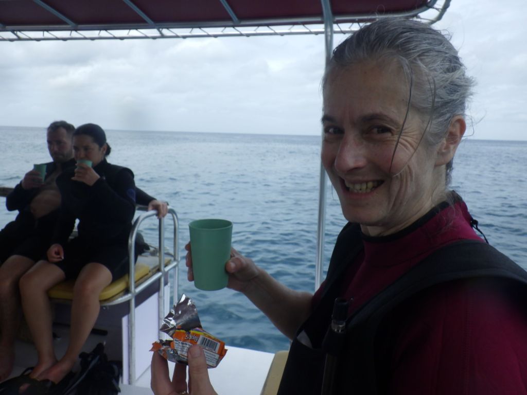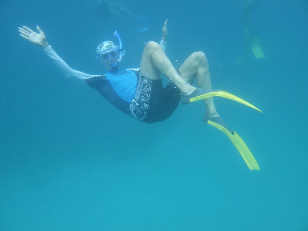 We hop back in the boat and move to explore another protected sancutary. As we jump overboard, we are immediately surrounded and greeted by a school of black and yellow fish. We find some bright blue ones and the green (funny looking) parrot fish. We try not to get slammed into the rocky shores as we follow the corals as it falls away to a full reef wall teeming with fish. We swim through several other schools of small fish and see all sizes, shapes and colors. I could easily get lost in this – figuratively. We only actually lose each other a few times and then swim away from the boat once or twice (remember to look up out of the water a few times.)