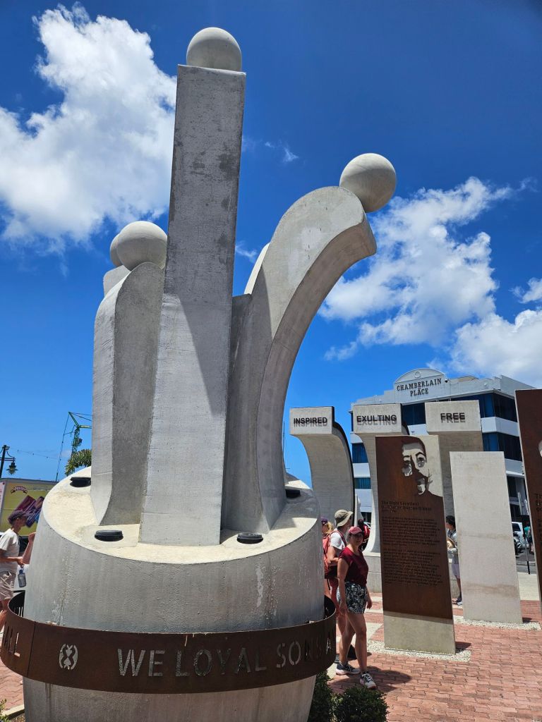 A powerful new symbol of this history is the recently reenvisioned Heroes Plaza which has a sculpture with large broken chains and human figures to represent all races, gender, and backgrounds of people from enslaved Africans, indentured laborers like the Scots and Irish, native americans and indiginous, and even white settlers who came from all different economic classes.